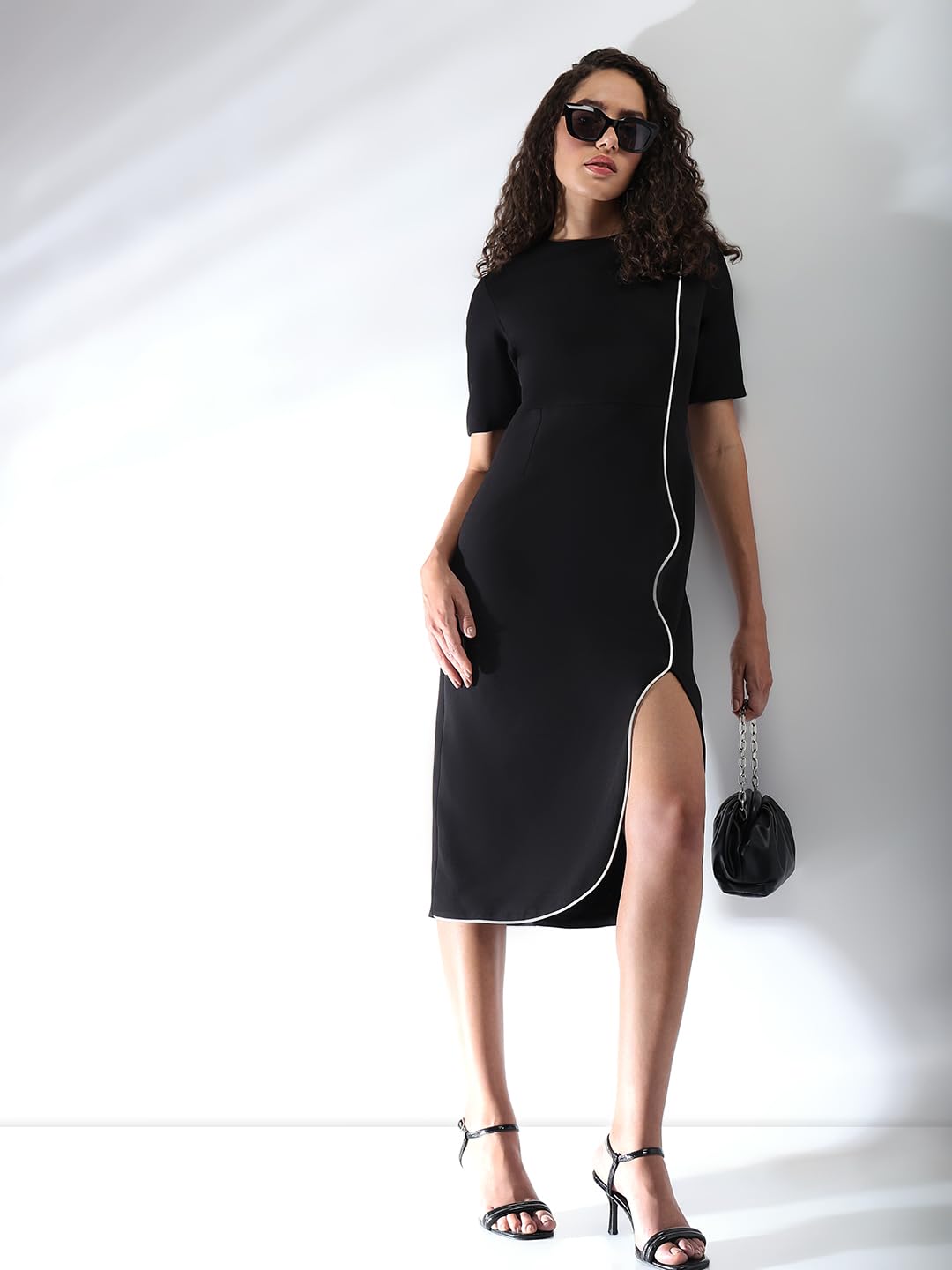 Elevate your style with this chic black midi dress. Featuring a sleek fitted silhouette with white piping along the front, it offers a sophisticated touch. The dress is designed with a front slit for a modern twist, short sleeves, and a round neckline that complements its elegant look. Perfect for any occasion, this dress combines timeless class with contemporary details.