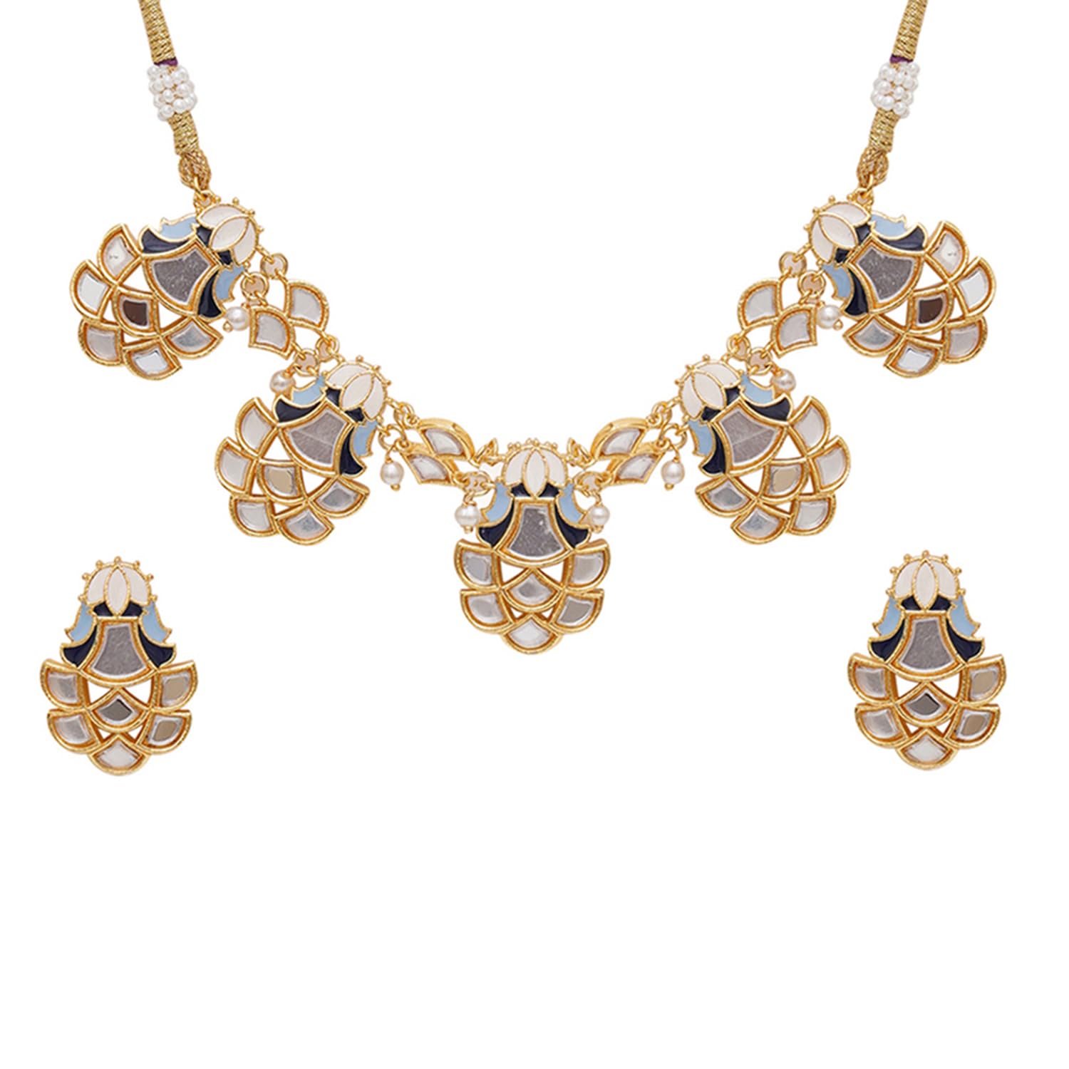 VOYLLA Festive Hues Mirror Work Enamelled Brass Gold Plated Choker Jewellery Set