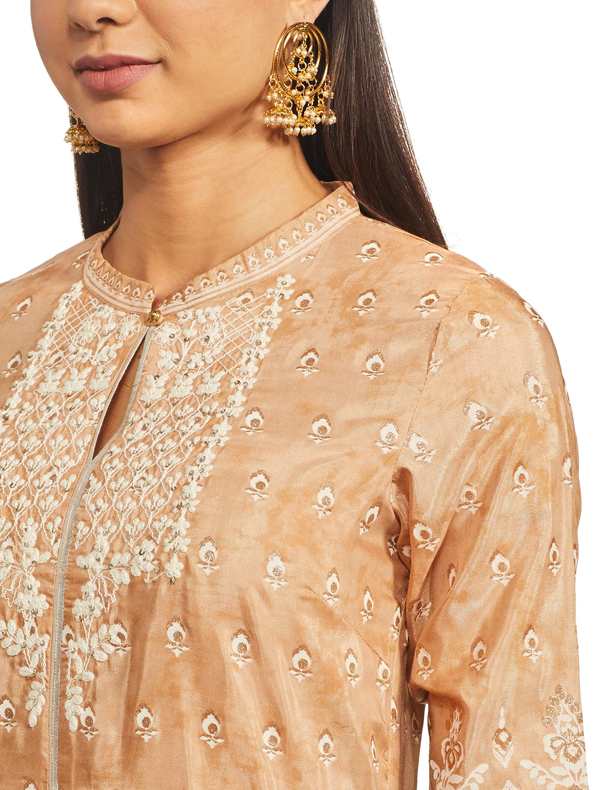 Details: Light orange festive gown with Ecru floral print in mandarin collar and three-quarter sleeves.