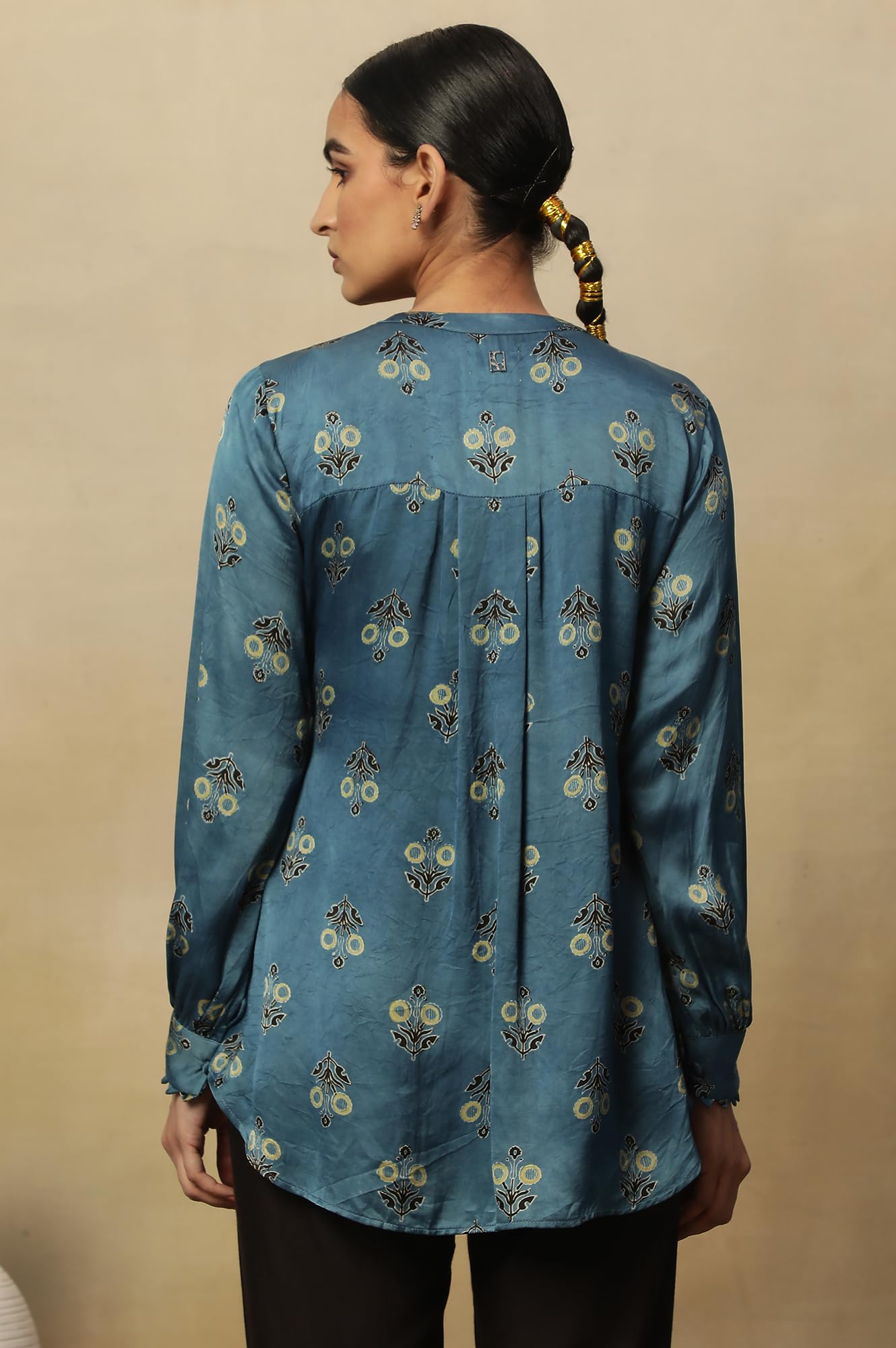A light blue ajrakh block printed top with mandarin collar & curved hem. It features gathered sleeves with origami triangle detail. The body is further highlighted with delicate mirror work.