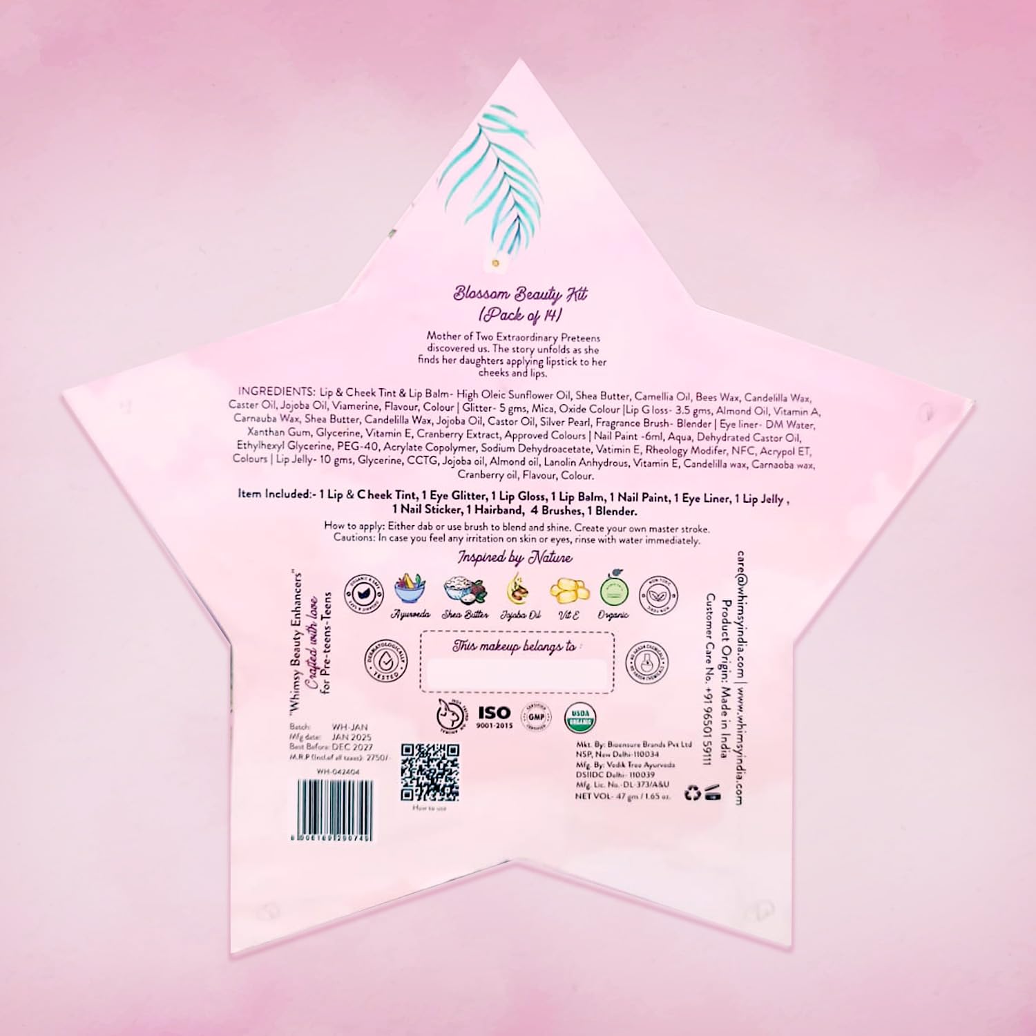 - Whimsy Beauty Blossom Beauty Kit is an all-in-one makeup kit which includes 1 Lip Gloss, 2 Lip Cheek Tint,1 Lip Jelly,1 Nail Paint, 1 Eye Glitter, 1 Eye Liner, 1 lip Balm, 1 Beauty Blender, 1 Nail sticker, 1 Hairband, 4 Makeup Hairband.