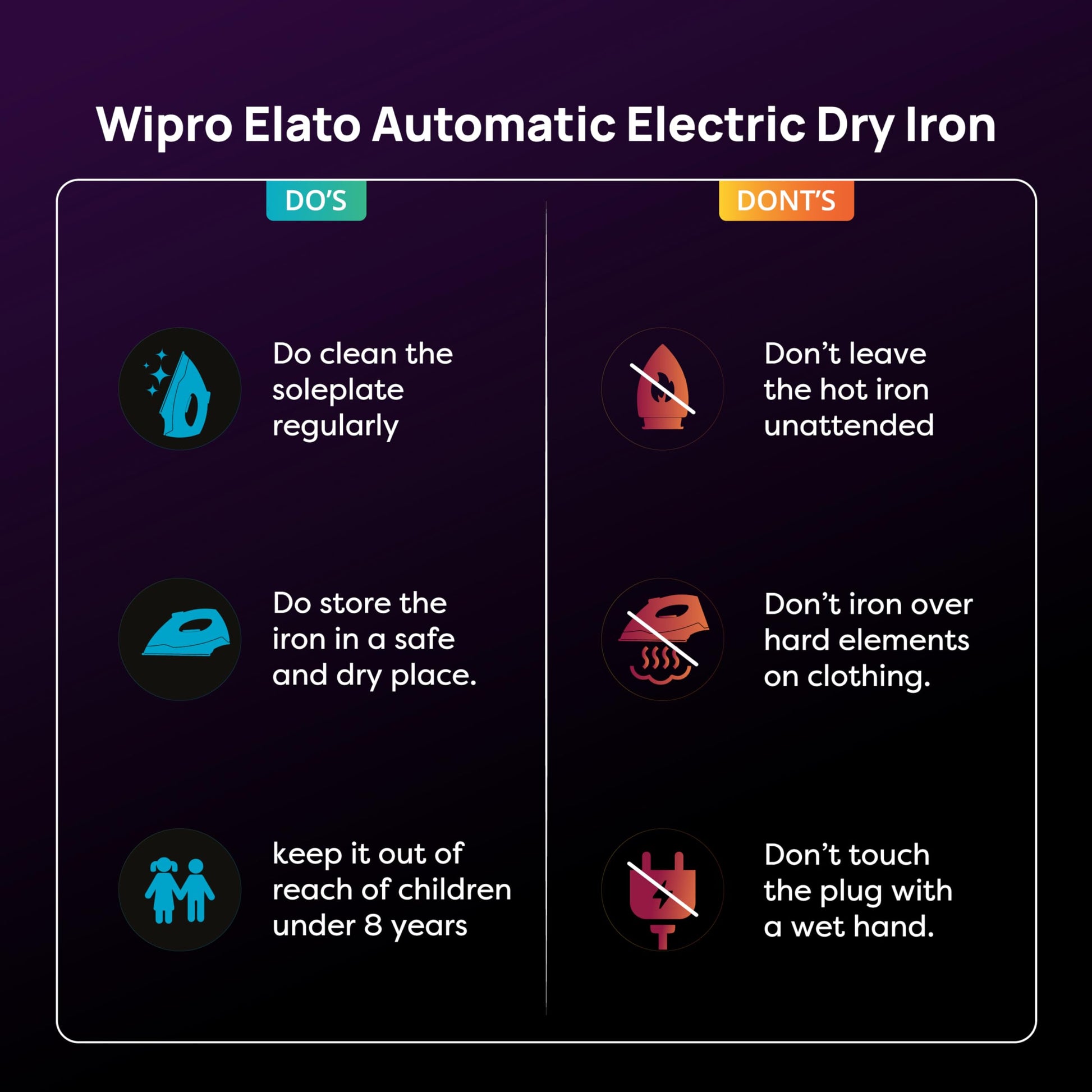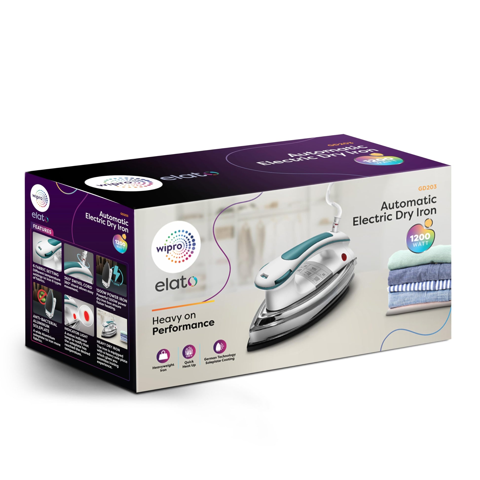 Wipro Elato GD203 1200 Watt Heavyweight Dry Iron, Quick Heat Up, Anti Bacterial German Weilburger Dual Coated Soleplate,5 Modes, Dry Iron Press,Wrinkle Free Clothes in One Shot, 2 Year Warranty,Blue