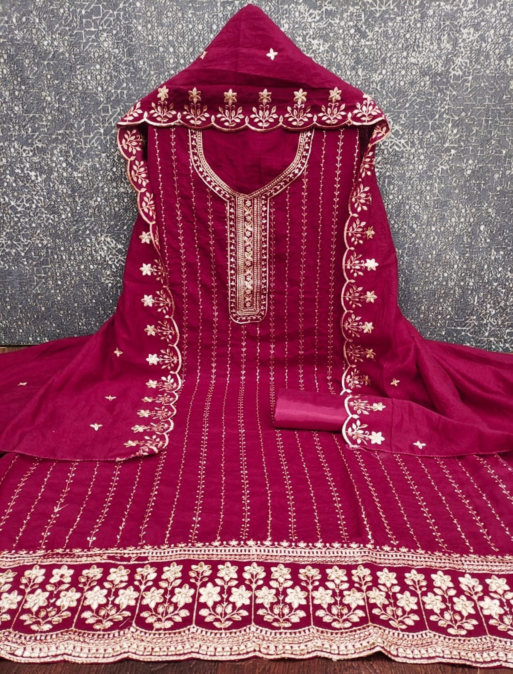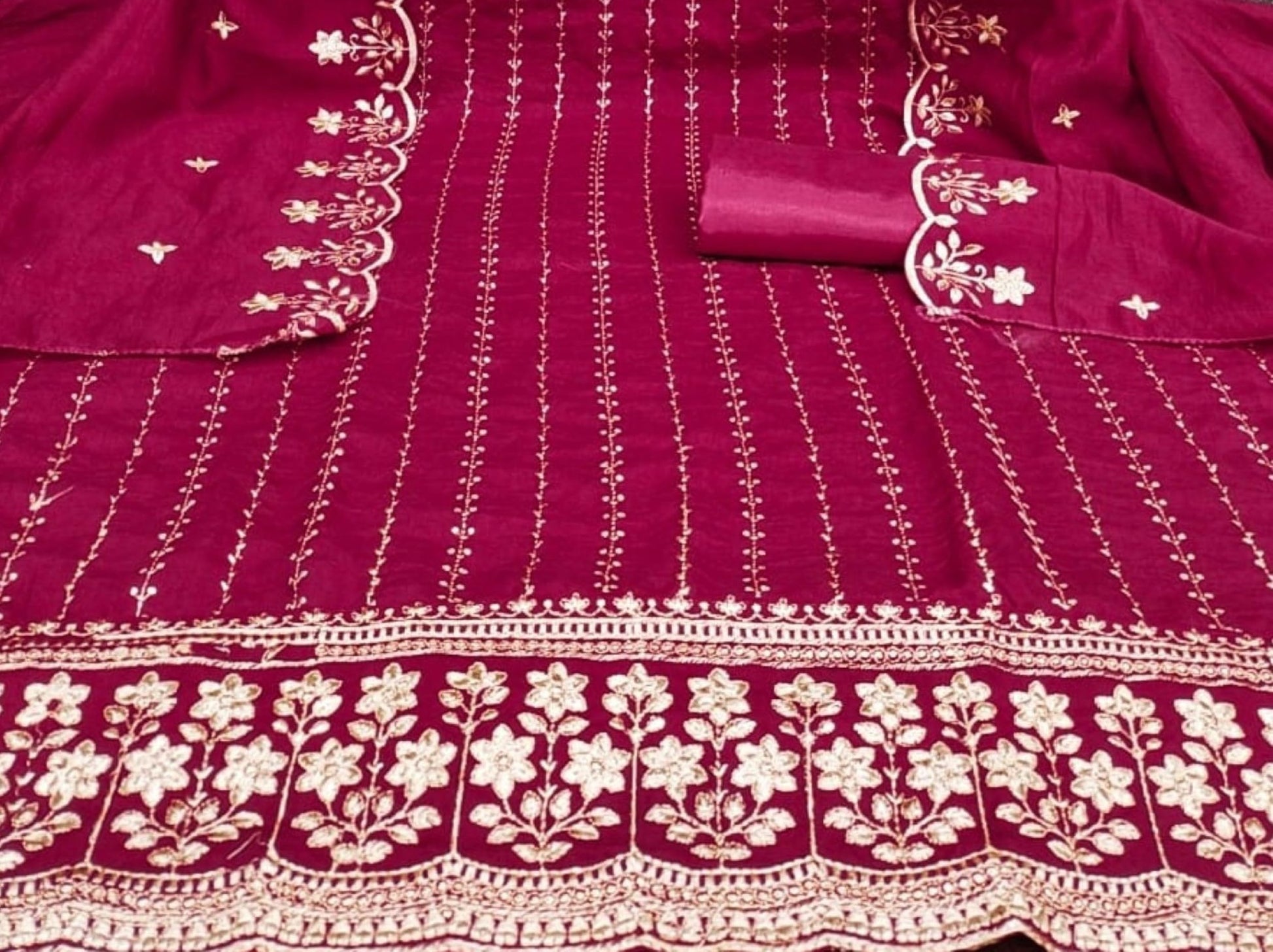 This exquisite Vichitra Silk dress material is a perfect blend of elegance and tradition. The ivory white top is beautifully enhanced with intricate multi-work embroidery, while the maroon base and dupatta create a regal contrast. The dupatta features detailed zari embroidery and a graceful border, making it a stunning highlight of the set. Paired with a comfortable Indian Santoon bottom, this ensemble offers both style and comfort. Perfect for weddings, festivals, or grand celebrations, this outfit brings out timeless charm and sophistication. Accessorize with statement jewelry and heels to complete the look.