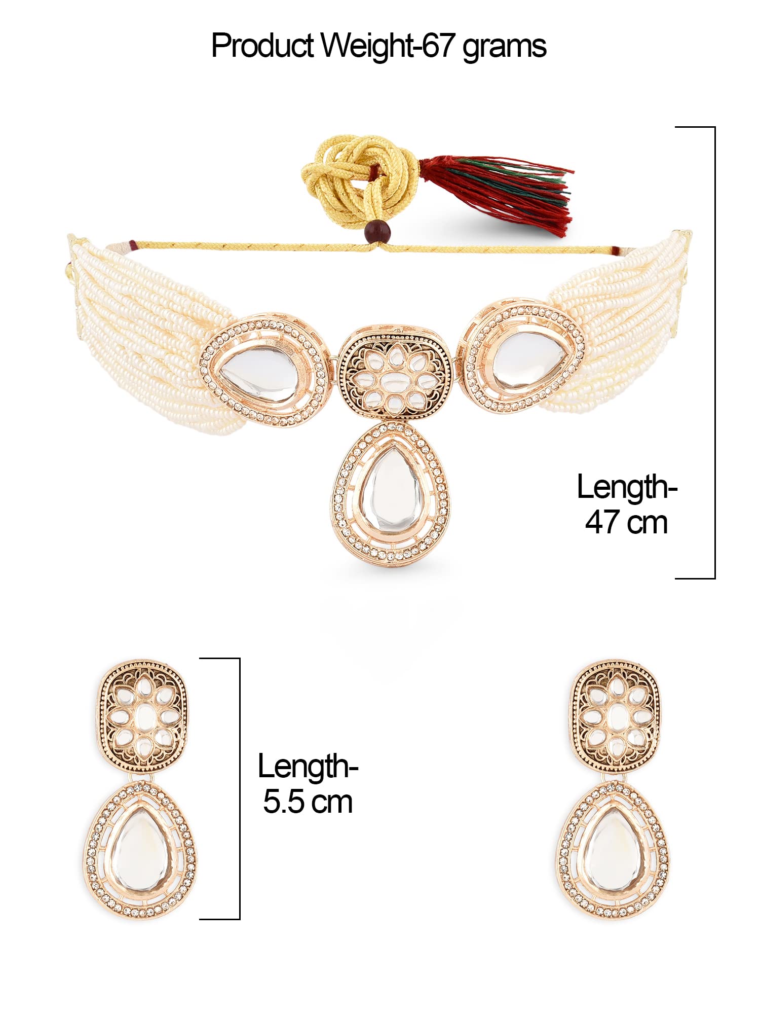 - Dimensions: Necklace Length-47 cm, Earring Length-5.5 cm, Ring Diameter-2 cm (Adjustable), Product Weight-67 grams