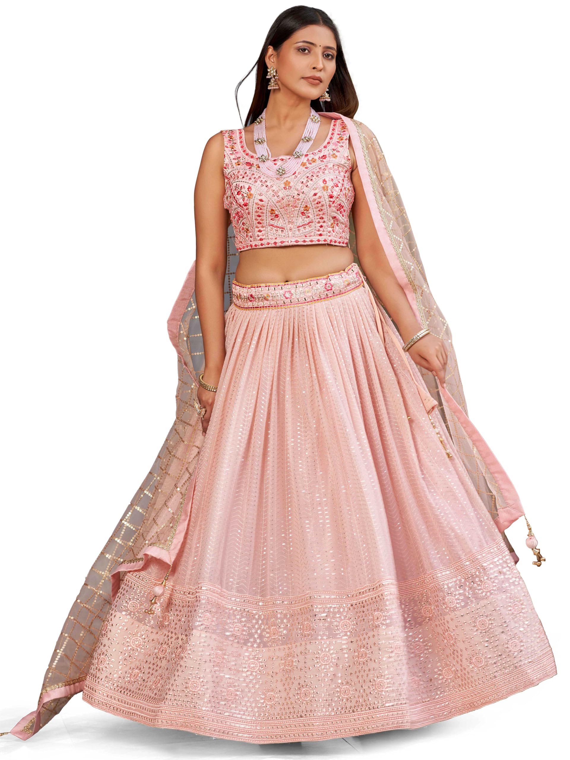 Zeel Clothing Women's Sequins Mirror Work Georgette Semi Stitched Lehenga Choli With Dupatta (5083-Peach-Wedding-Stylish-New; Free Size)