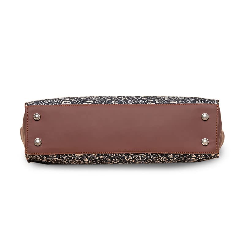 ZOUK FloMotif Floral Printed Jute Handcrafted Vegan Leather Women's Black Structured Tote Bag Contemporary