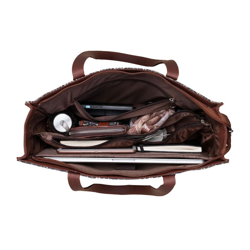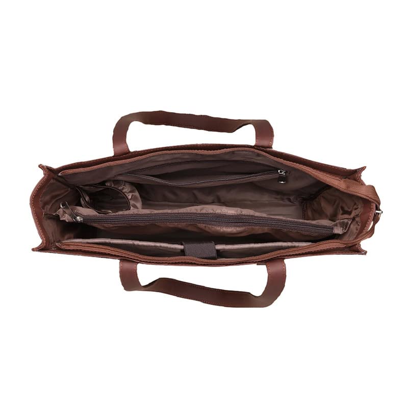 - Zouk office tote has a top zip closure for safety and comfort. The interior has 2 zip pocket, 1 bottle holder, 2 main compartment & 1 laptop compartment providing plenty of storage space for keeping phone, portable charger, keys, hairbrush, wallet, sunglasses, sanitizer and a pair of clothes