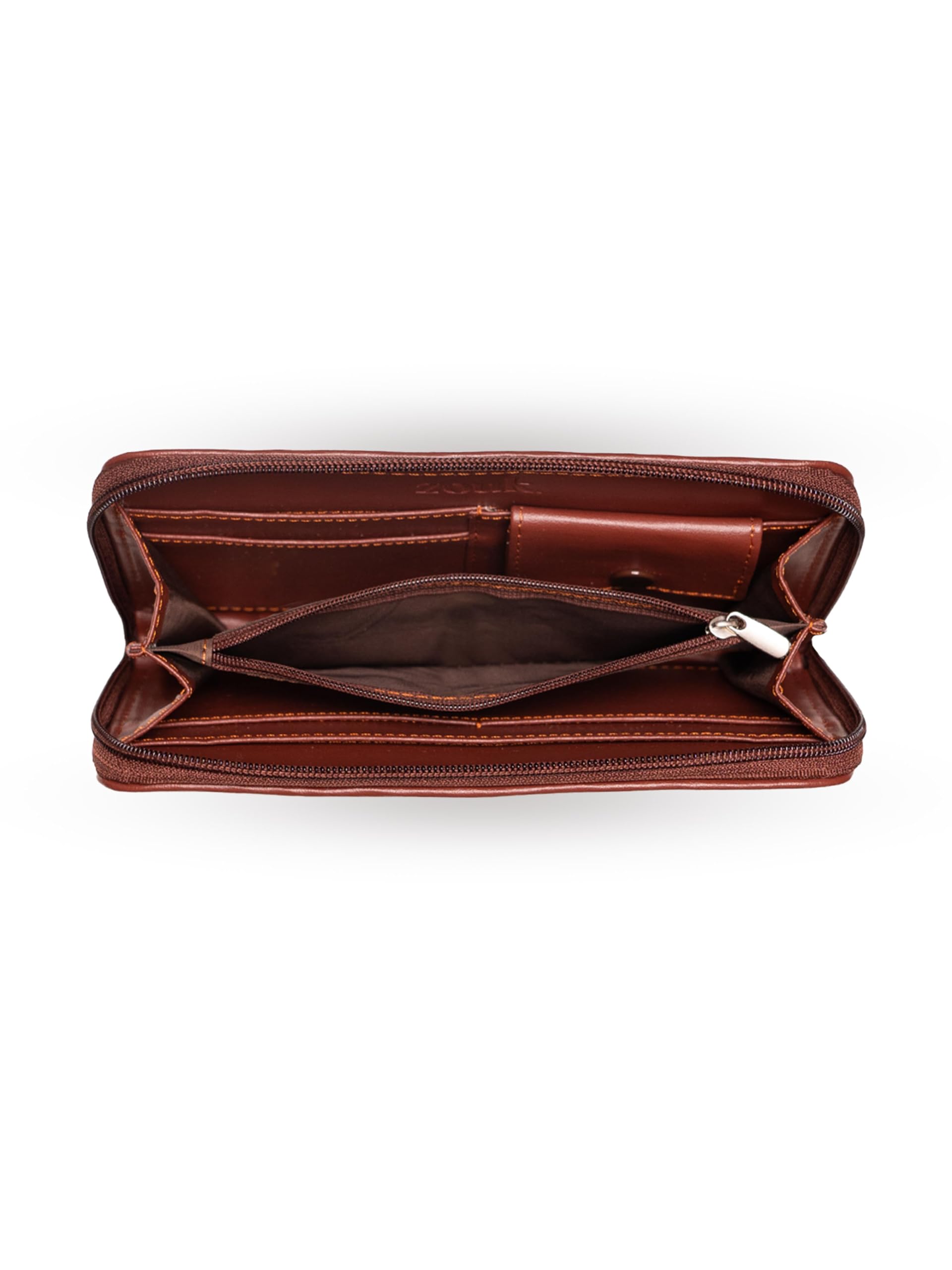 - This classic women's wallet made of vegan leather has two main compartments for cash and bills, as well as a central zipper compartment for coins, notes, and other small items. It also features four card slots, one slip pocket, and one coin pocket to help keep important items organized. Additionally, there is an external zip pocket that provides easy access to tickets and bills.