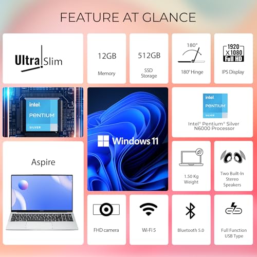 acer Aspire 3, Intel Pentium N6000, 12GB LPDDR4X RAM, 512GB SSD, HD, 15.6"/39.62cm, Windows 11 Home, Pure Silver, 1.5KG, A325-45, Thin and Light Laptop