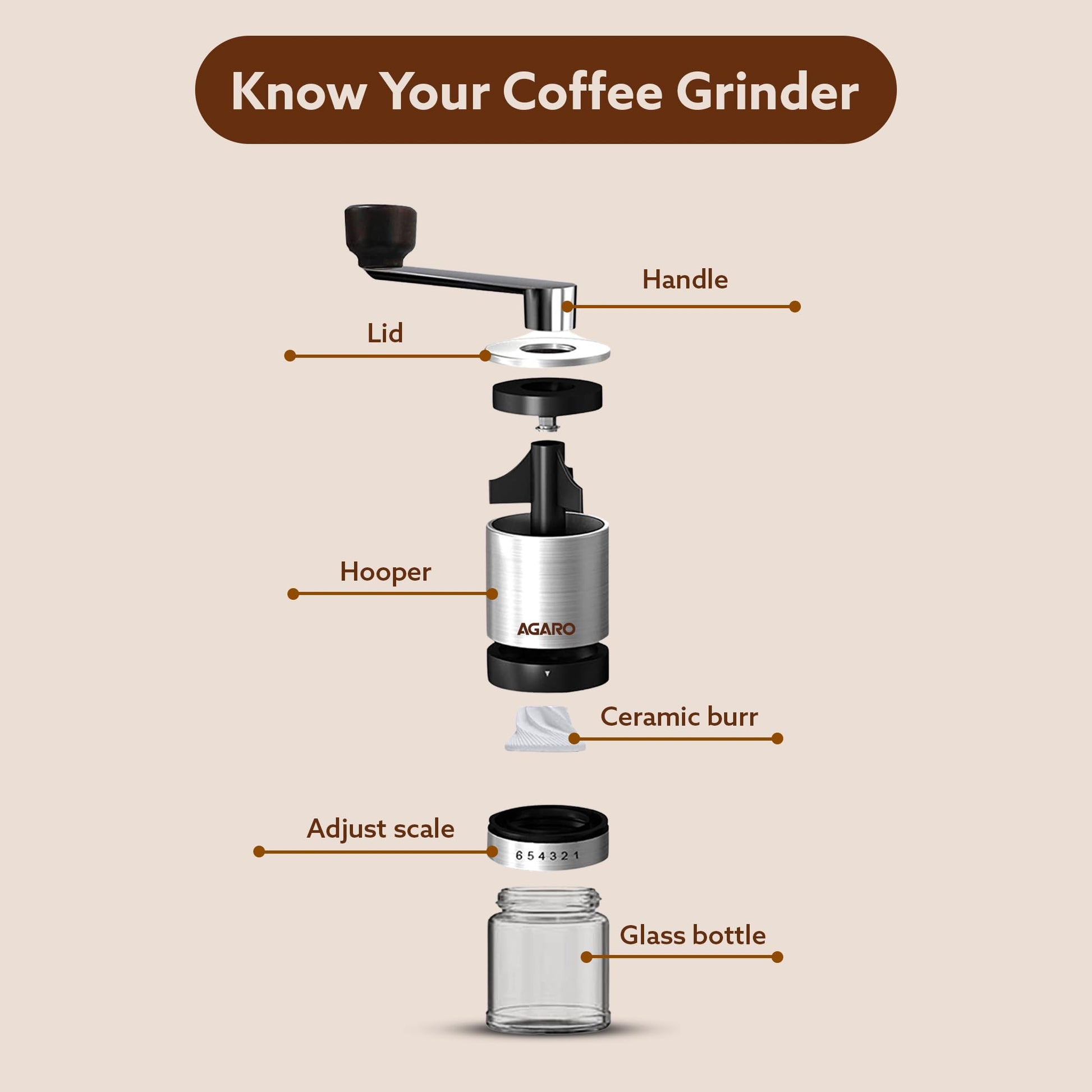AGARO Elite Manual Coffee Grinder, Ceramic Grinder with Glass jar, 6 Adjustable Settings, Stainless Steel Body, Tooth Handle, No Power, Whole Bean, Drip Coffee, Espresso, Silver