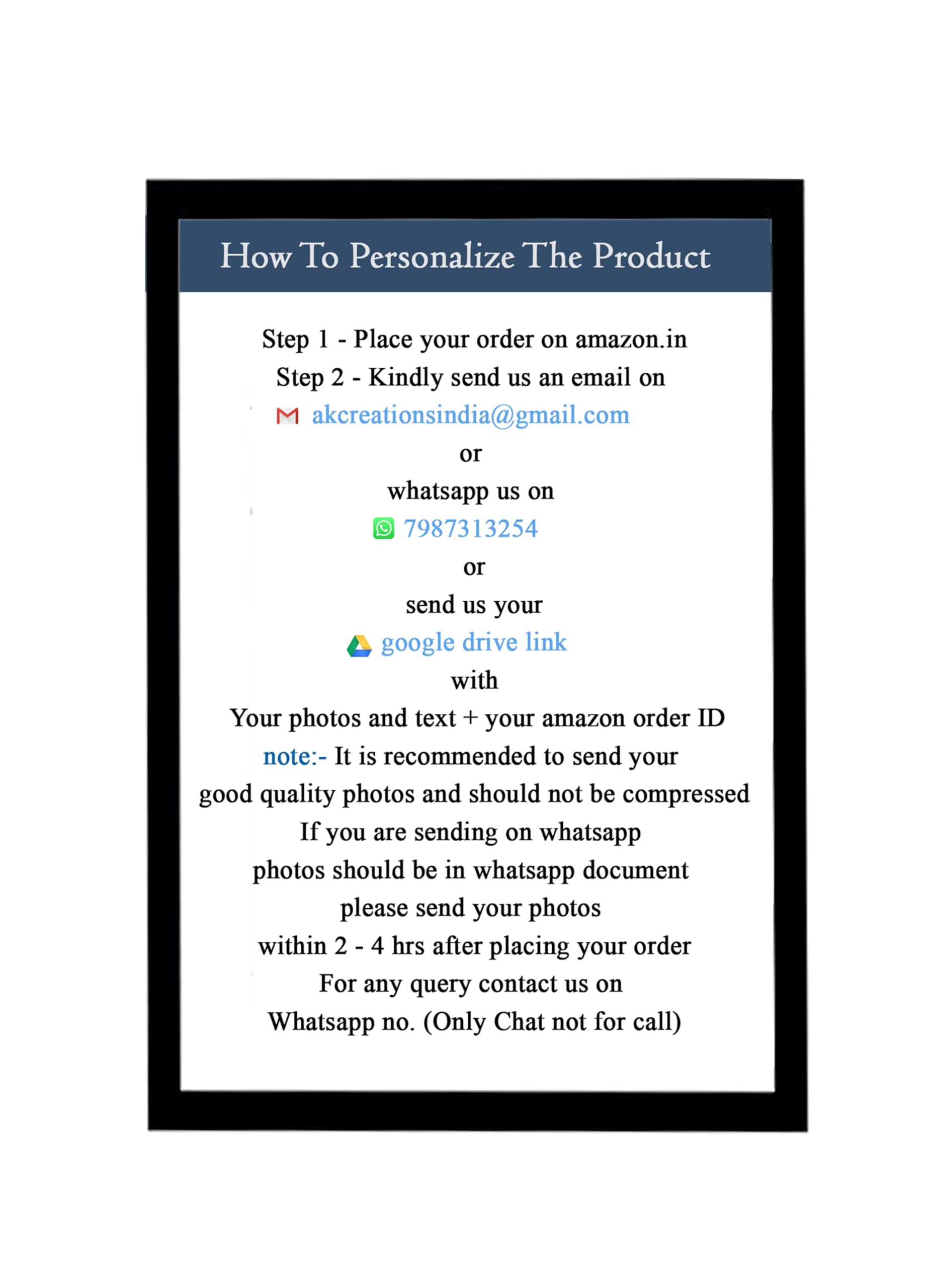 Details: Ak creations gives you a way to show your love to your love ones. Ak personalized photo collage frame is the best gift to frame your sweet memories for your love ones. it is fully moisture proof, scratch proof and no glass on top.