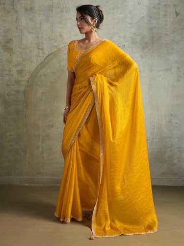AKHILAM Women's Yellow Chiffon Embellished Saree With Unstitched Blouse Piece (AMELIA13003_SUM)