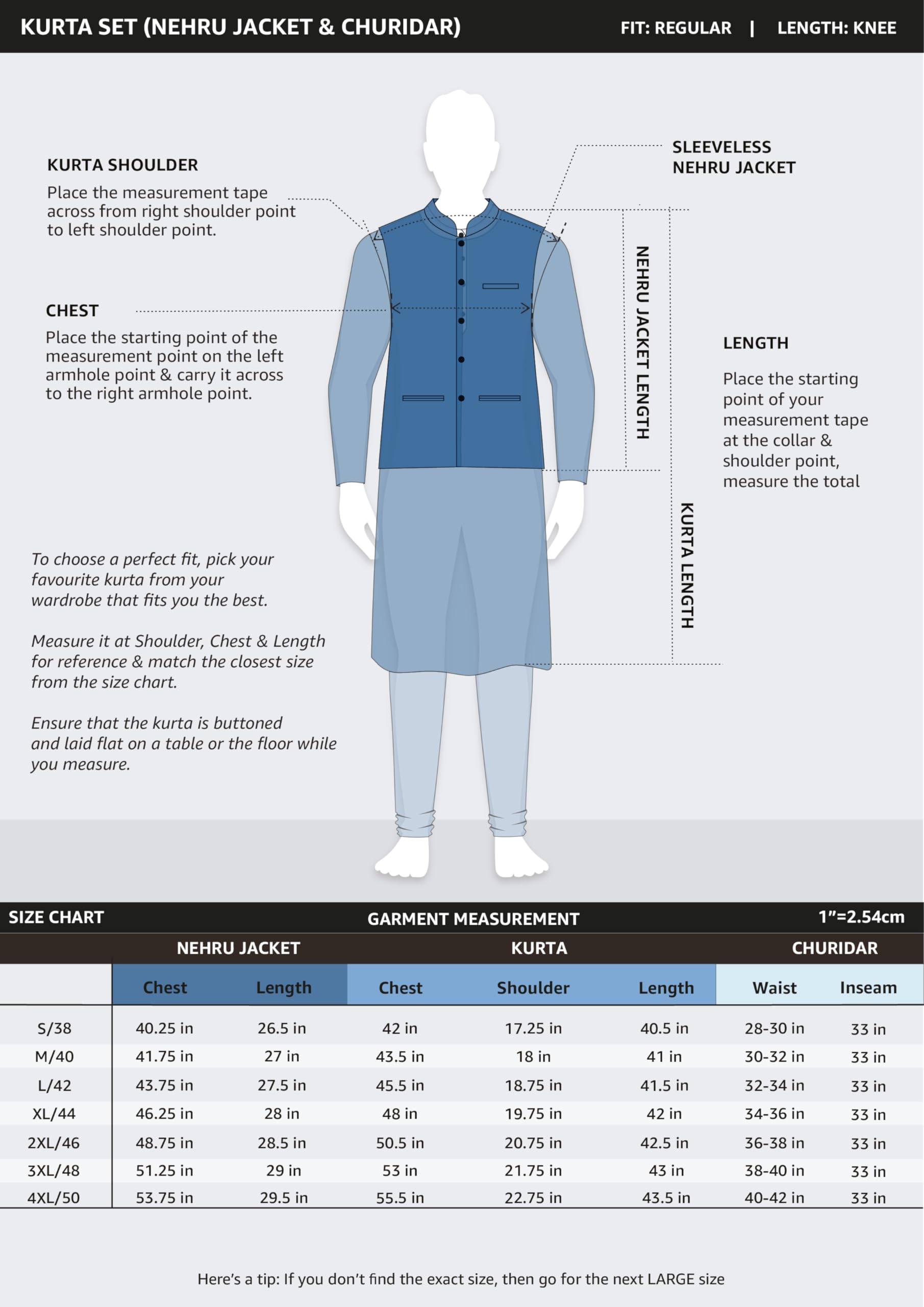- Set of 3 Pieces: Long Length (41") Kurta with Churidar Pyajama and Nehru Jacket.