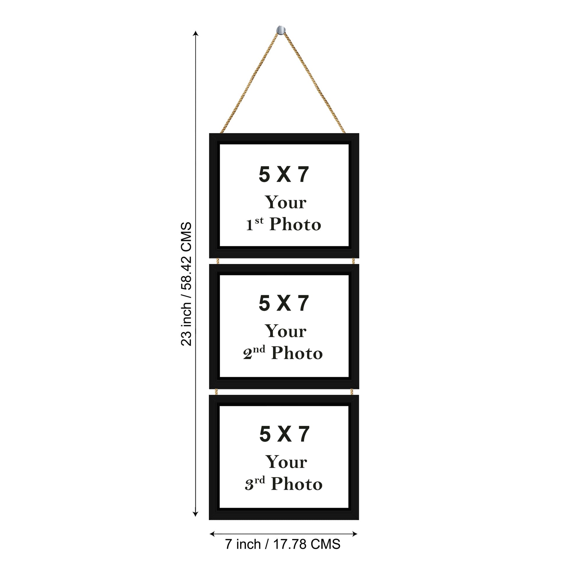 - [HANGING PICTURE FRAME SIZE] Each Frame has slot for 5 * 7 inch picture, Composite dimension : 23 x7 inch with premium frame & Thread.