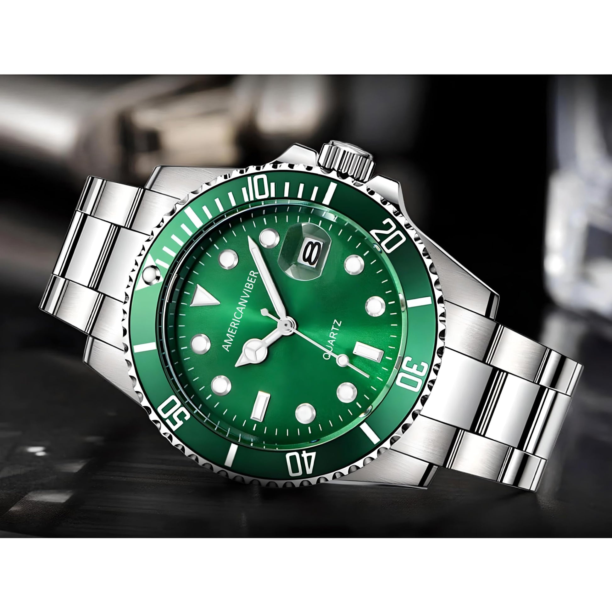 AMERICANVIBER Luxury Diver Watch with Green Dial, Stainless Steel Band, Date Display, Quartz Movement (Green)