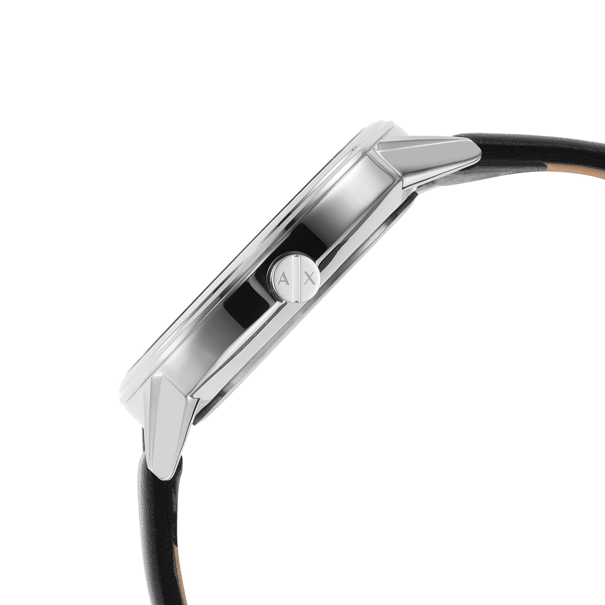 Armani Exchange's 42mm watch features a black skeleton dial, at least 50% recycled stainless steel case and strap buckle, multifunction movement and black leather strap with leather sourced from LWG Certified tannery.