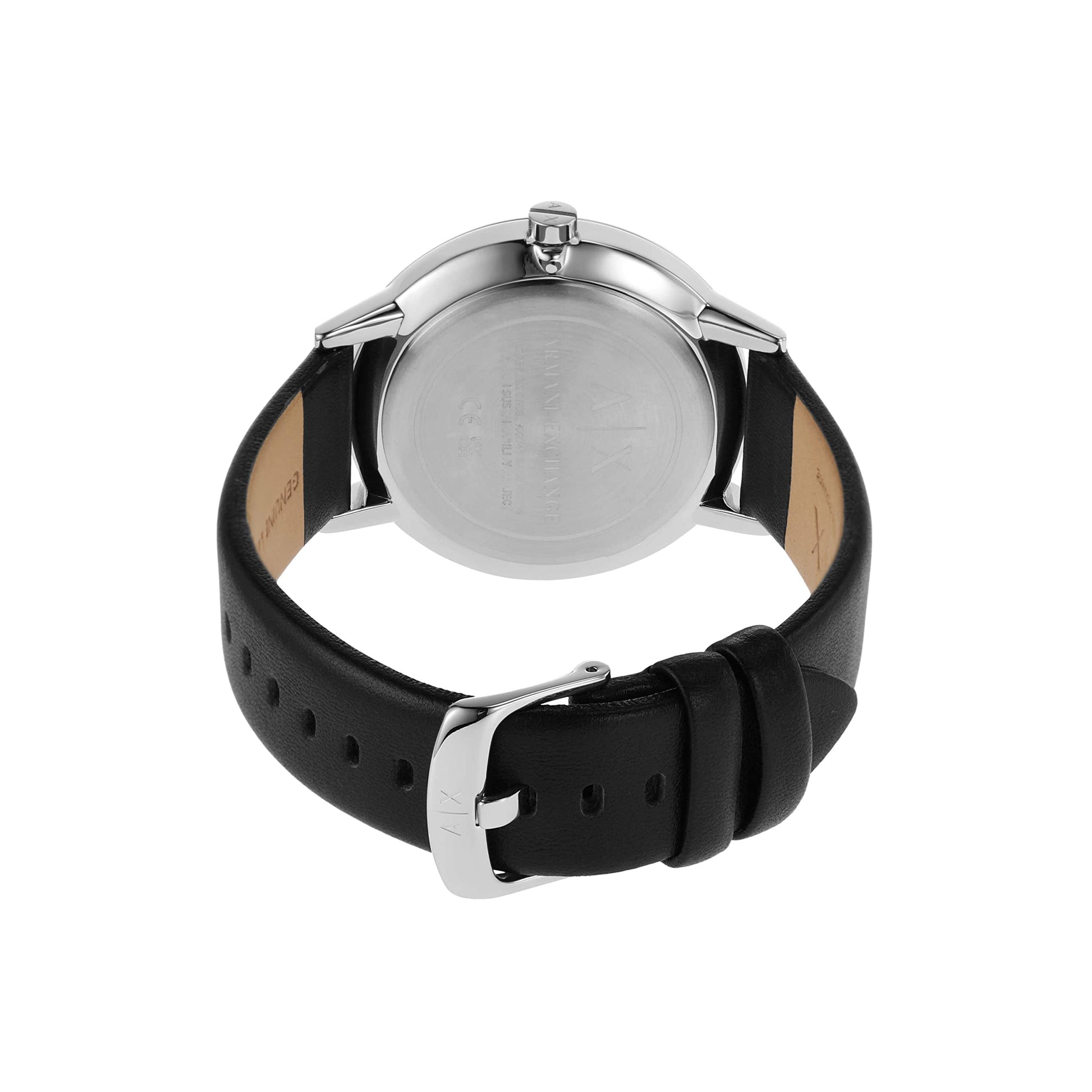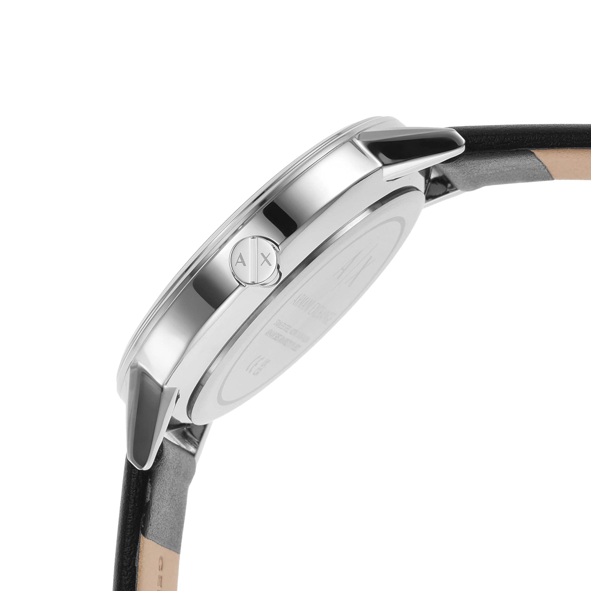 - Black plated leather strap with single prong strap buckle closure; interchangeable with Armani Exchange 20mm watch straps