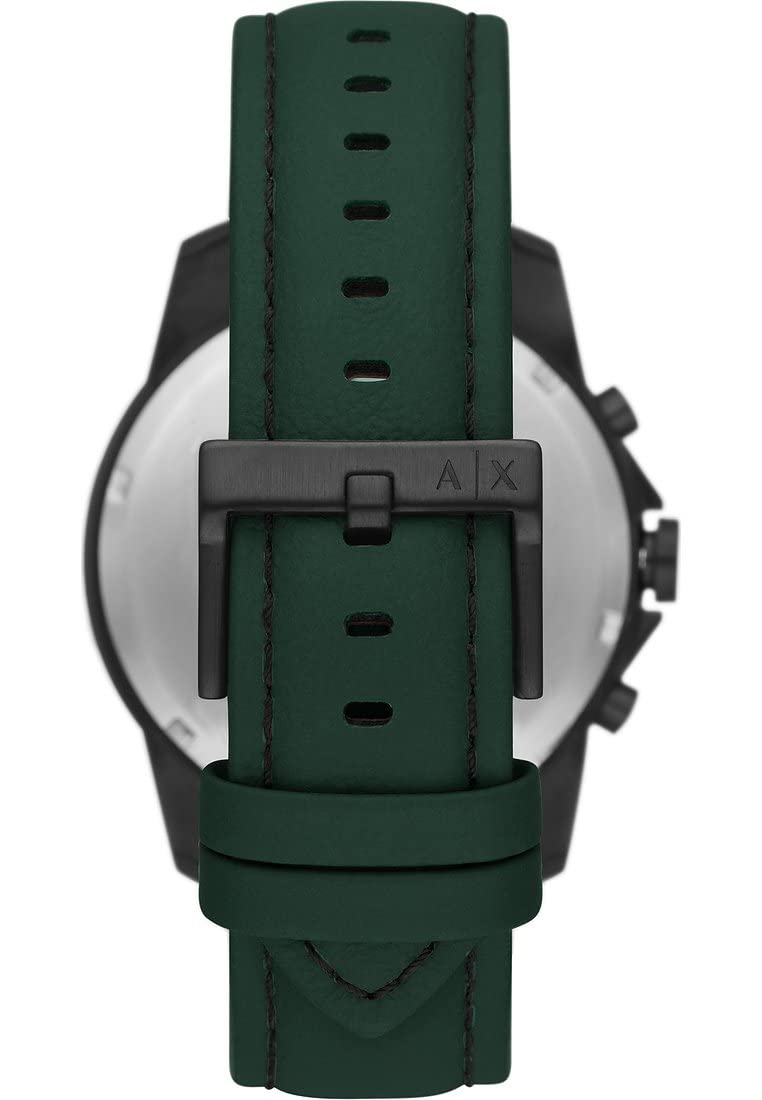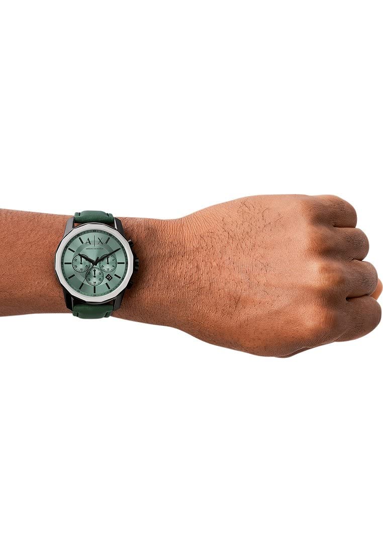 Armani Exchange's 44mm watch features a cd finish, sunray green dial, chronograph movement and green leather strap.
