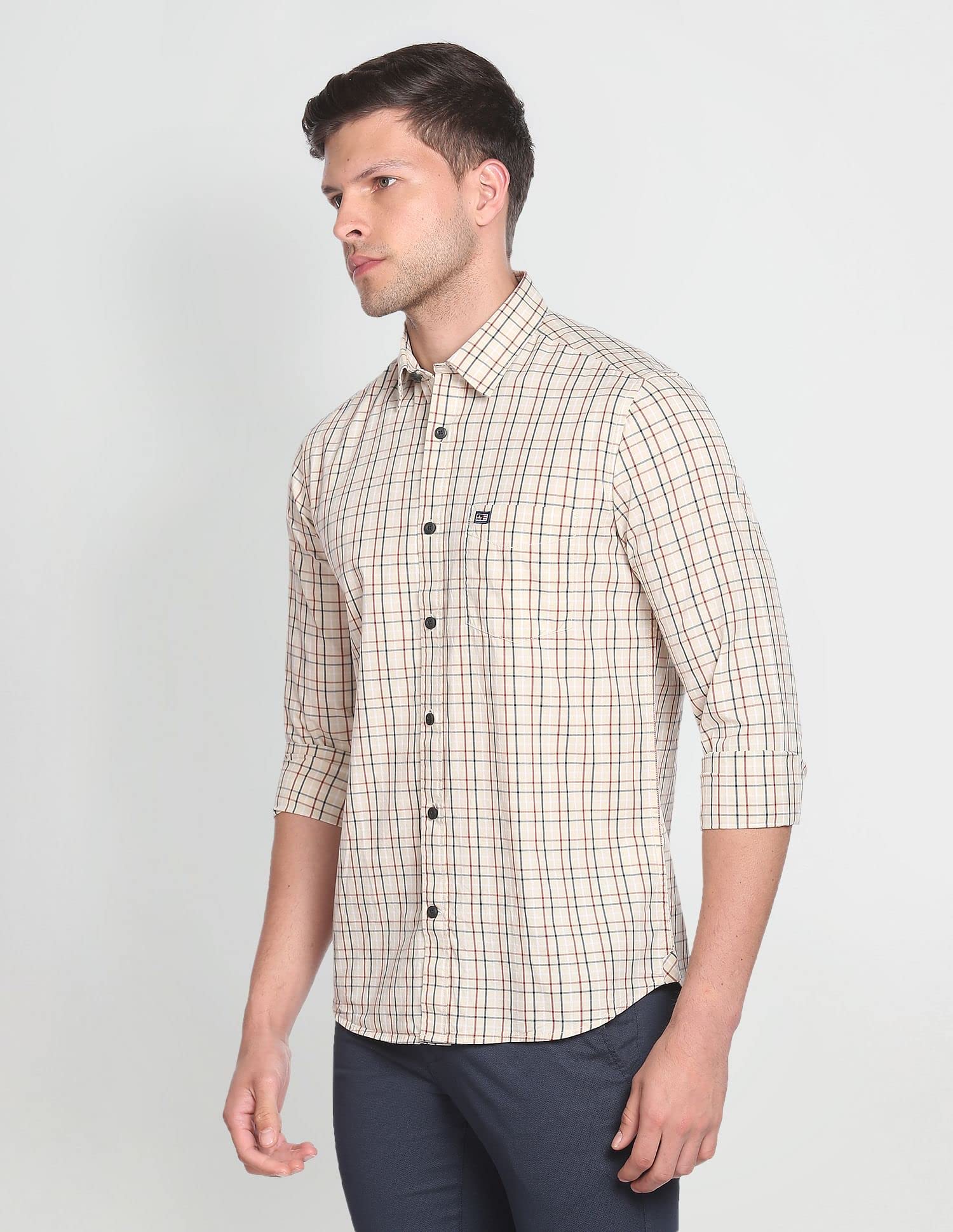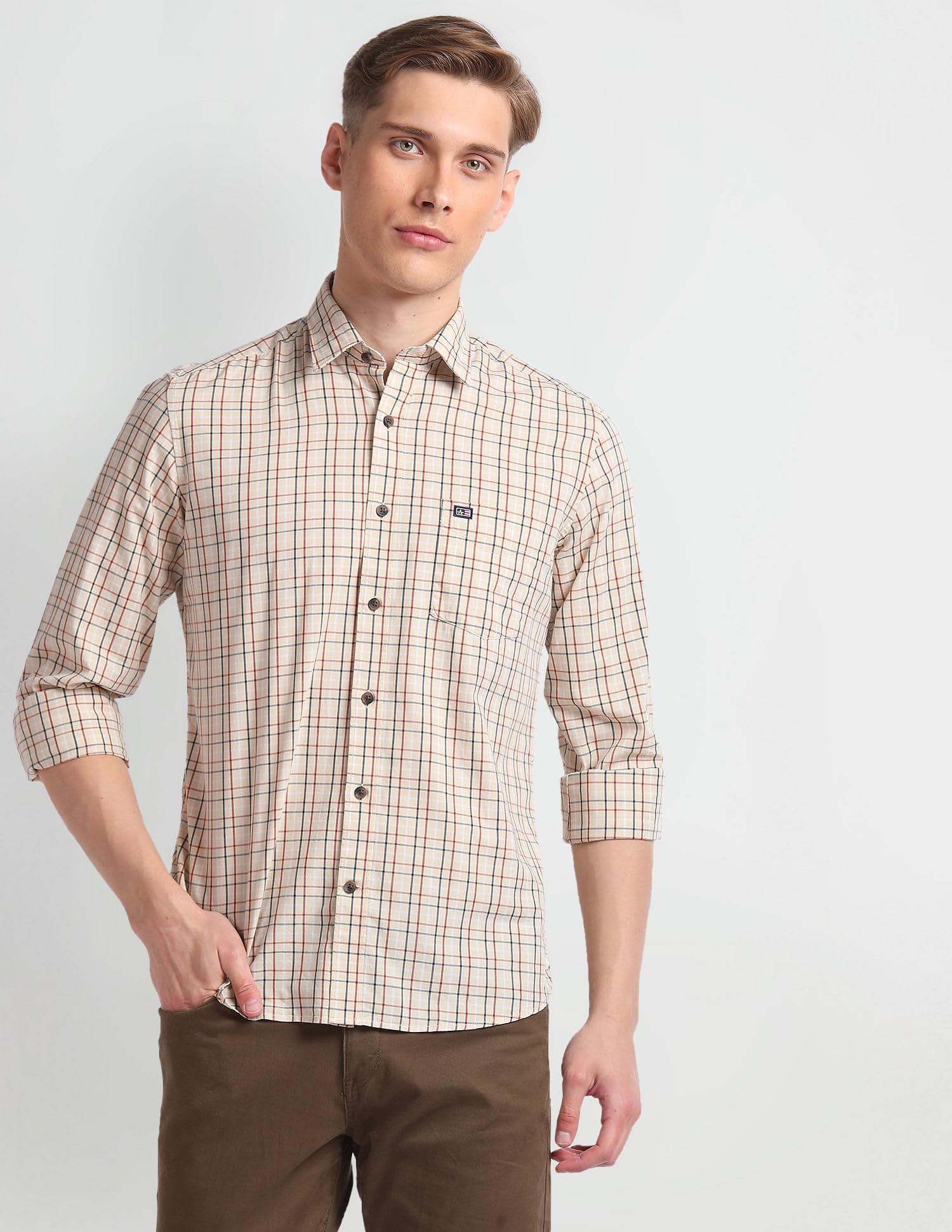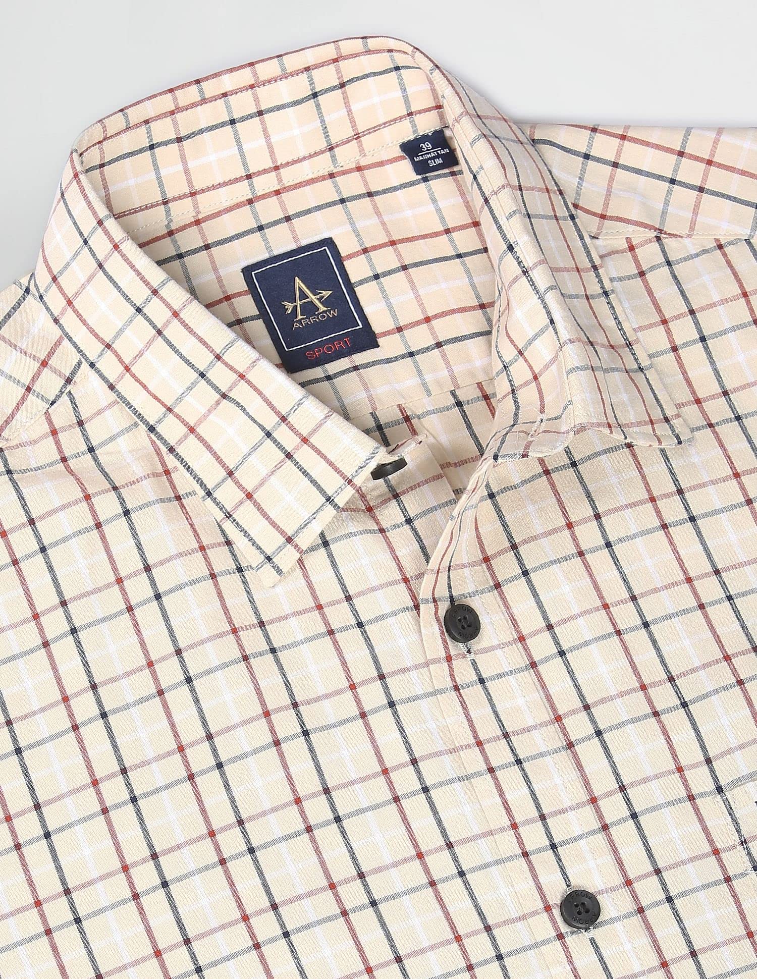 Arrow Men's Checkered Full Sleeve Slim Fit Point Collar Cotton Casual Shirt Beige