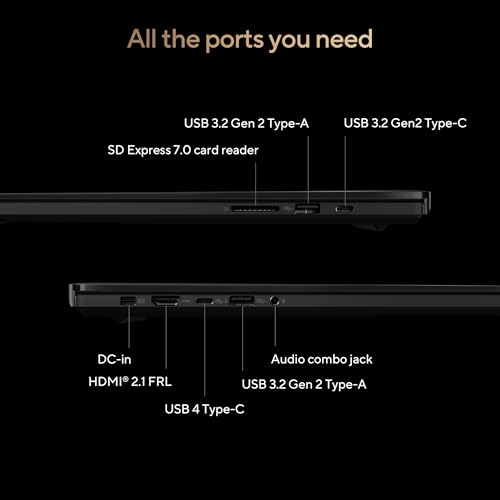 - Ports & Connectivity : 1x USB 3.2 Gen 2 Type-C with support for display / power delivery (data speed up to 10Gbps), 1x USB 4.0 Gen 3 Type-C with support for display / power delivery (data speed up to 40Gbps), 2x USB 3.2 Gen 2 Type-A (data speed up to 10Gbps), 1x HDMI 2.1 FRL, 1x 3.5mm Combo Audio Jack, 1x DC-in, SD Express 7.0 card reader