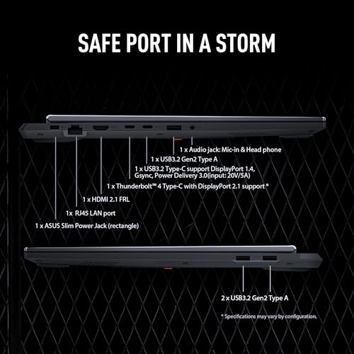 - I/O Ports : 1x RJ45 LAN port, 1x Thunderbolt 4 with support for DisplayPort / G-SYNC (data speed up to 40Gbps), 1x USB 3.2 Gen 2 Type-C with support for DisplayPort / power delivery (data speed up to 10Gbps), 3x USB 3.2 Gen 2 Type-A (data speed up to 10Gbps), 1x HDMI 2.1 FRL, 1x 3.5mm Combo Audio Jack