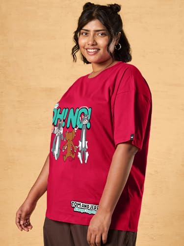Bewakoof Official Tom & Jerry Merchandise Women Graphic Print Oversized Fit Half Sleeve Round Neck Cotton Jersey Plus Size Tshirt_654543_Red_6XL
