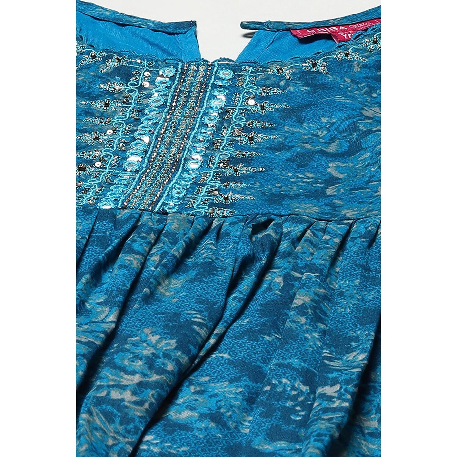 Biba Girl Teal Blue Cotton Flared Printed Kurta Garara Suit Set