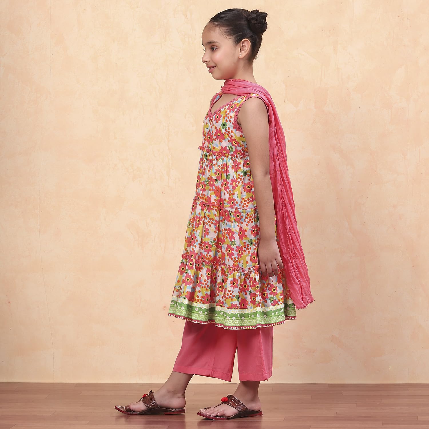 BIBA Girls Coral Tiered Cotton Printed Kurta suit set