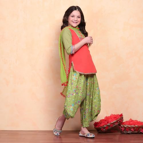 Biba Girls Org-Grn Straight Cotton Solid Kurta suit set