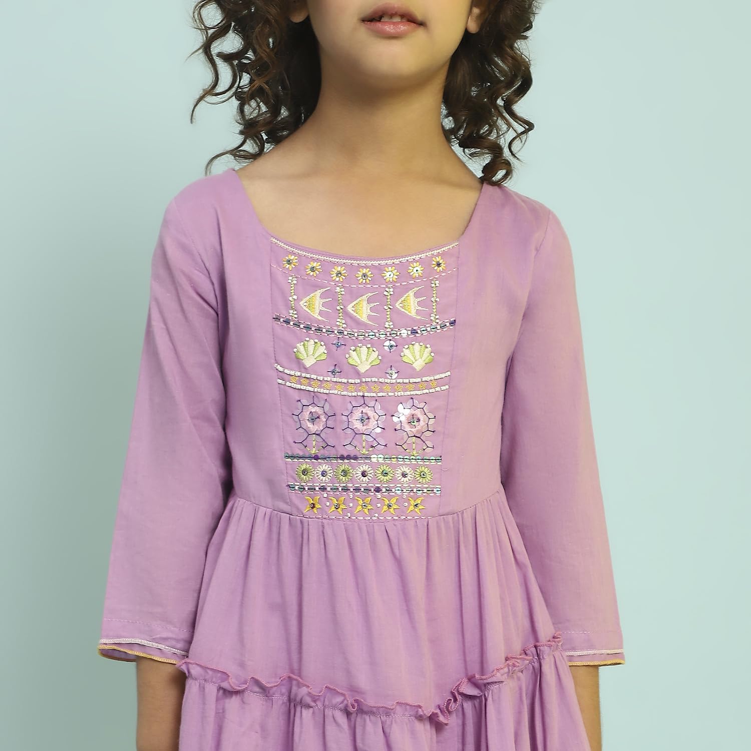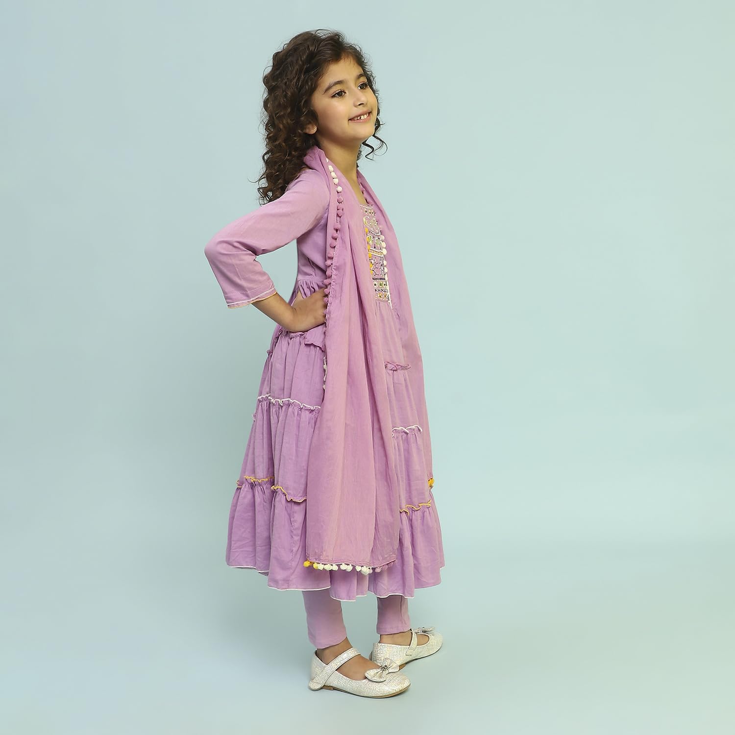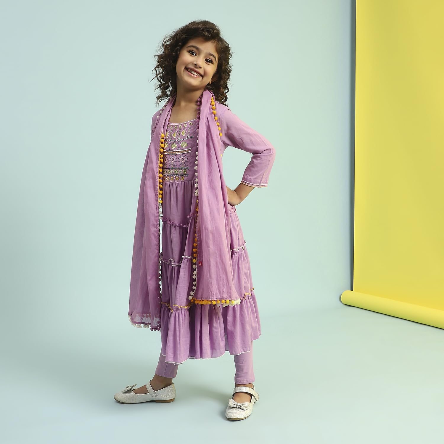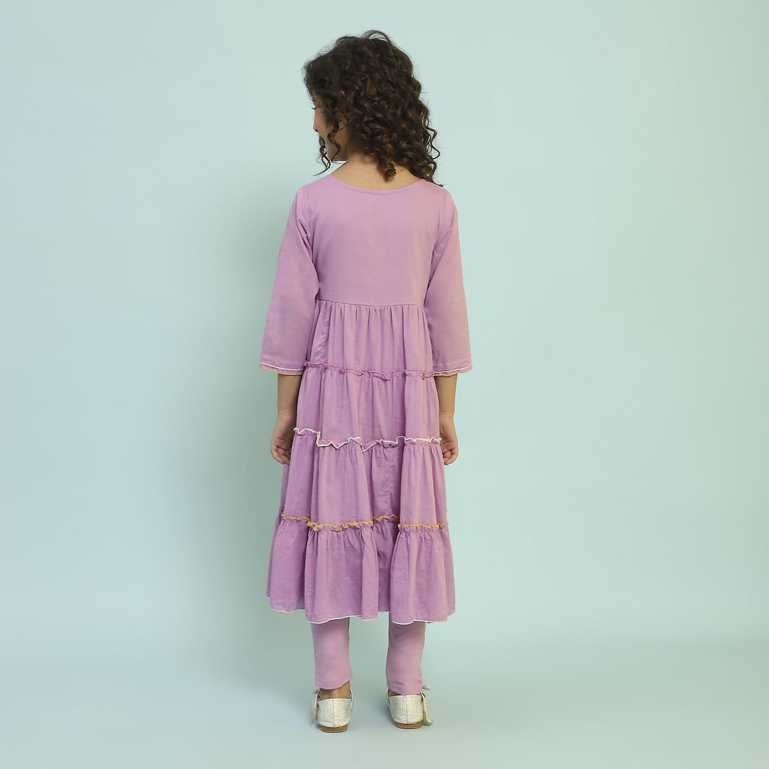 BIBA Girls Violet Tiered Cotton Solid Kurta suit set