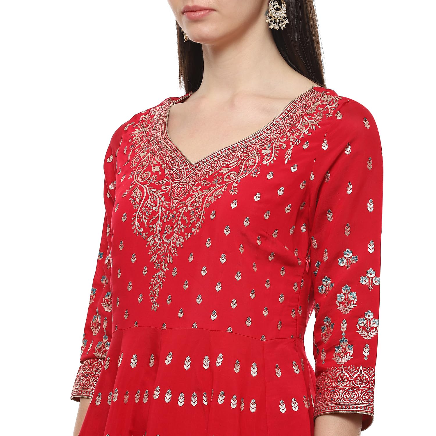 Biba Women Red Silk Anarkali Kurta Churidar Suit Set