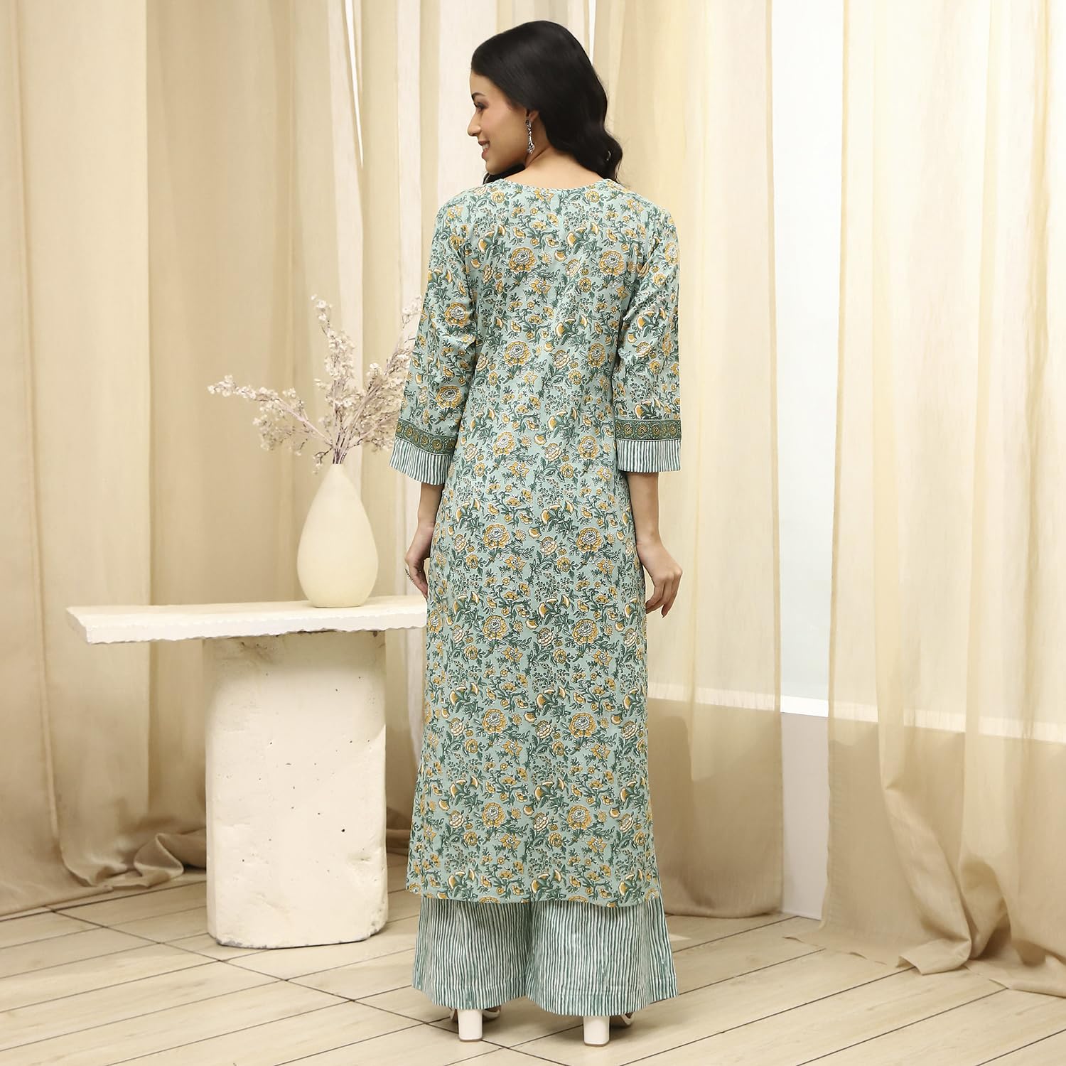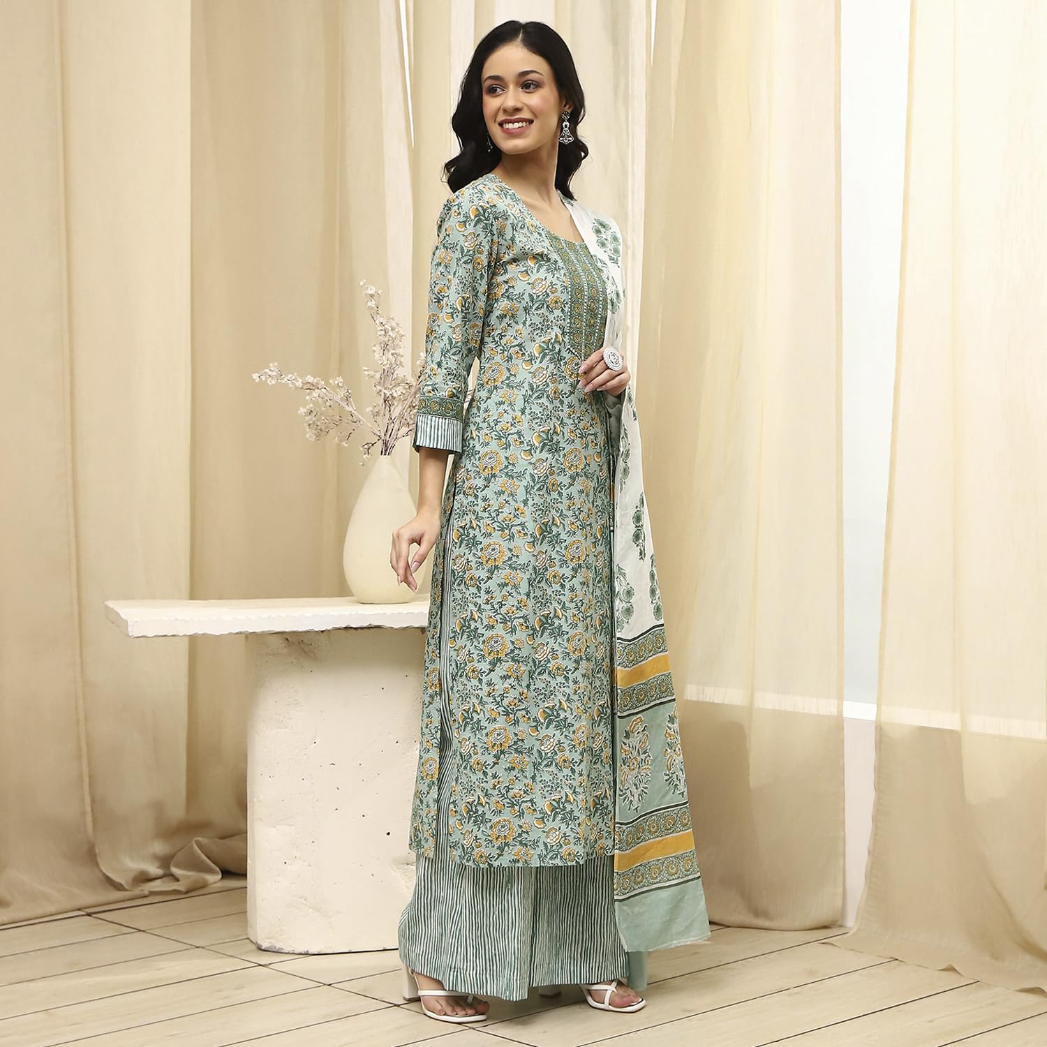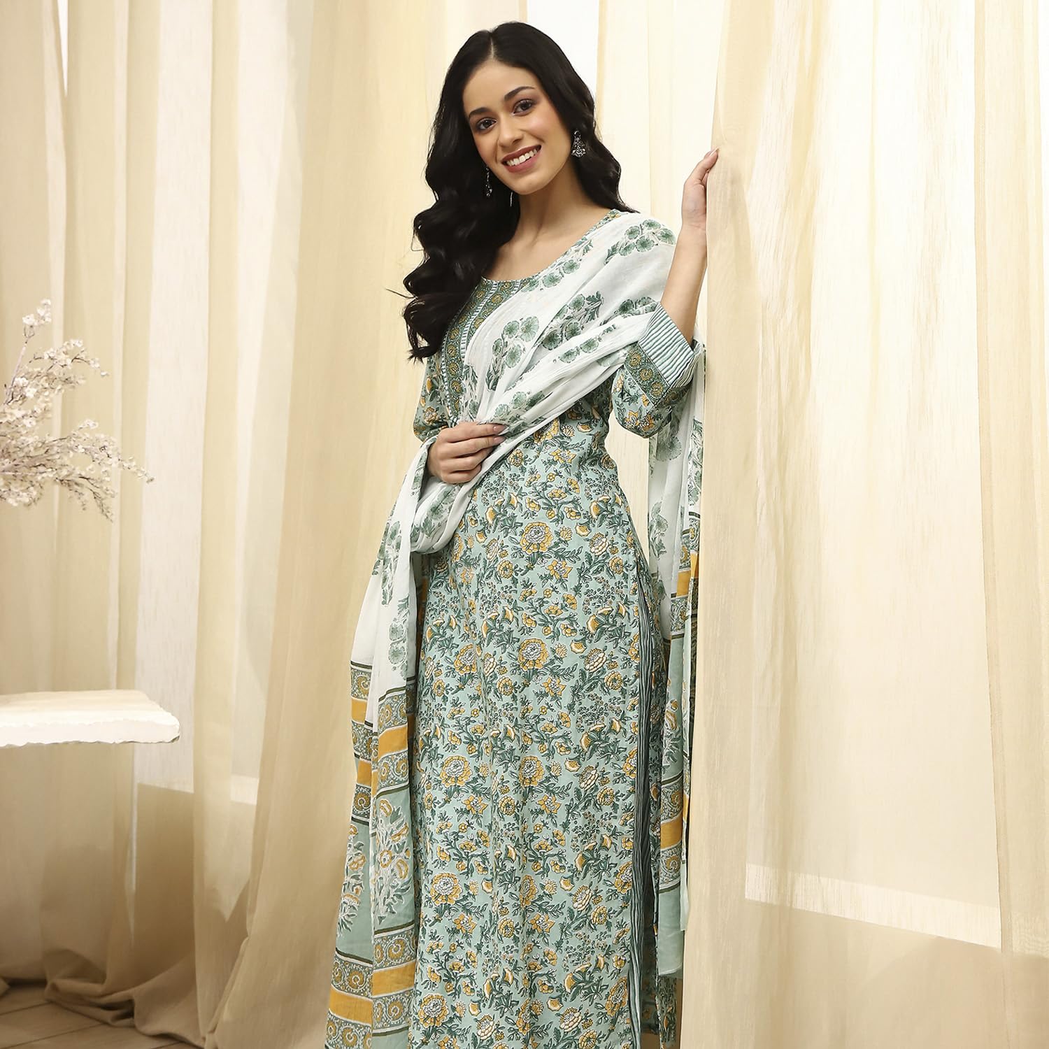 BIBA Women Green Cotton Screen Print Unstitched Suit Set_FREE SIZE