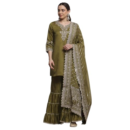 Biba Women Mehndi Green Cotton Silk Straight Suit Set_40