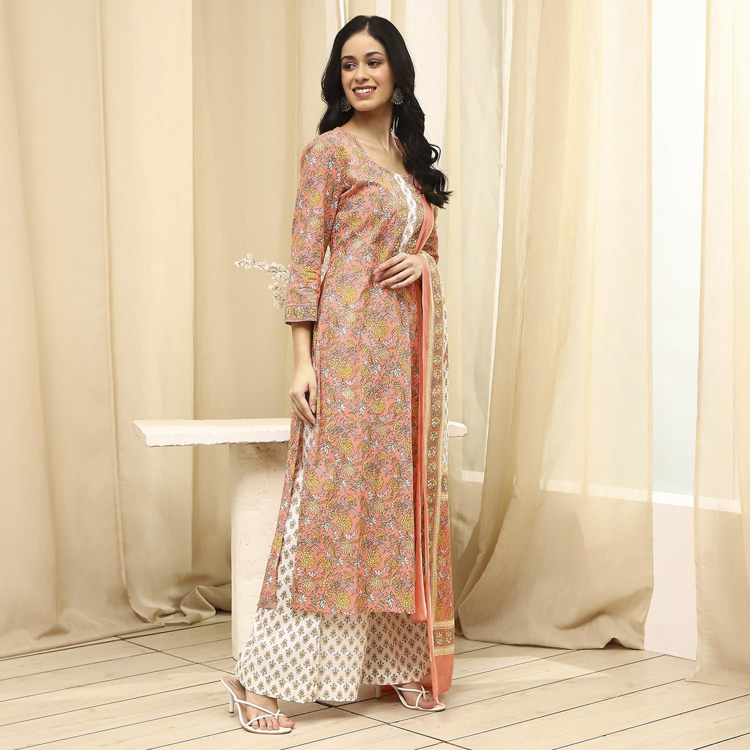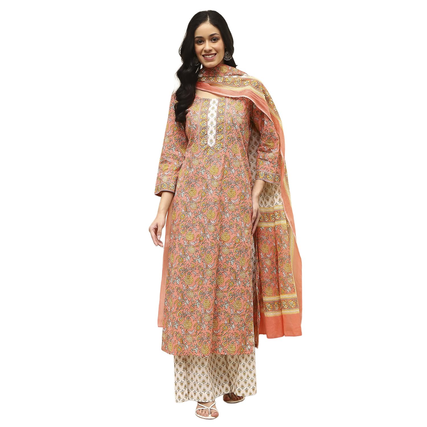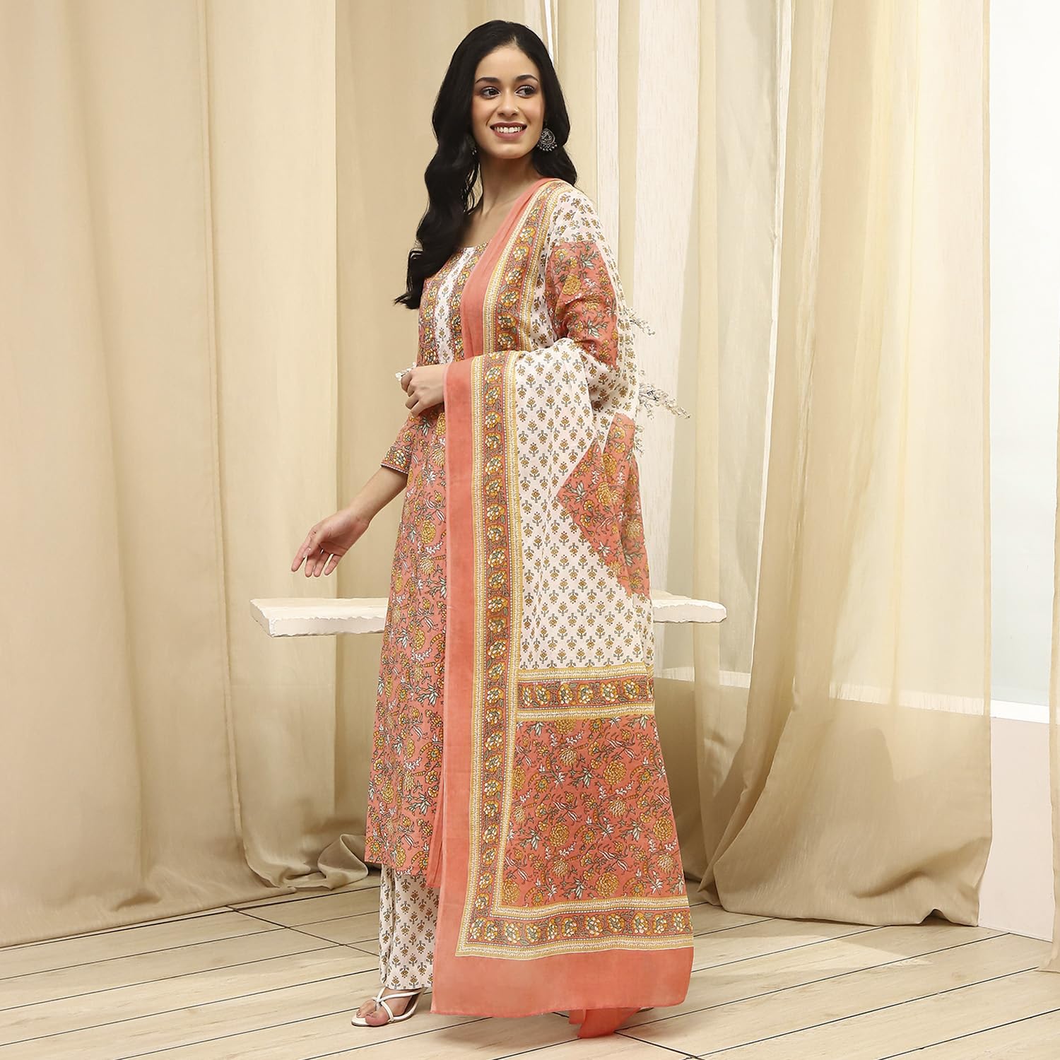 BIBA Women Peach Cotton Screen Print Unstitched Suit Set_FREE SIZE