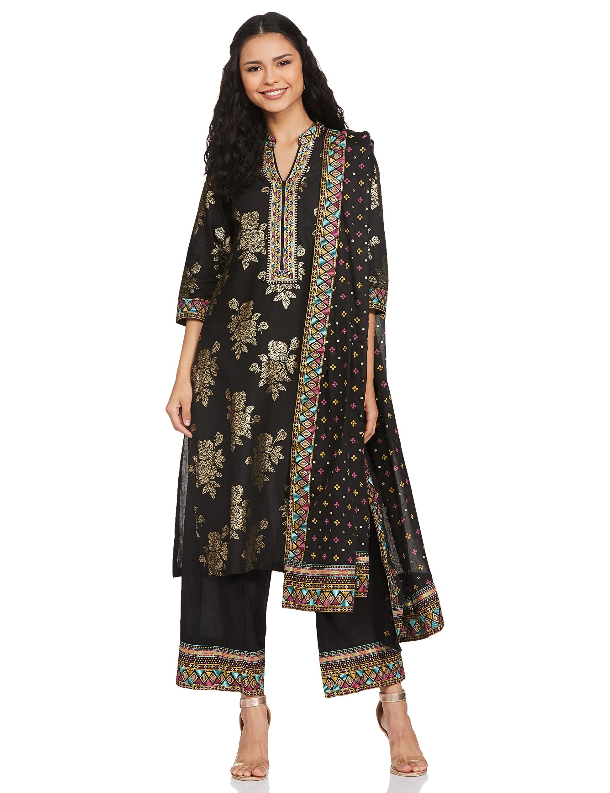 A classy black suit set accentuated with floral metallic print. The set includes a band collared kurta, straight palazzo pants and multicolored print dupatta. The base fabric of this set is cotton.