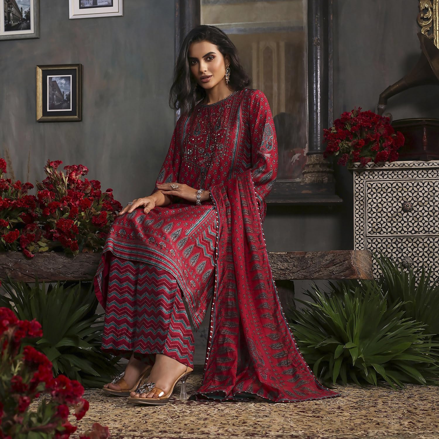 Biba Women Red Viscose Straight Printed Kurta Set_42