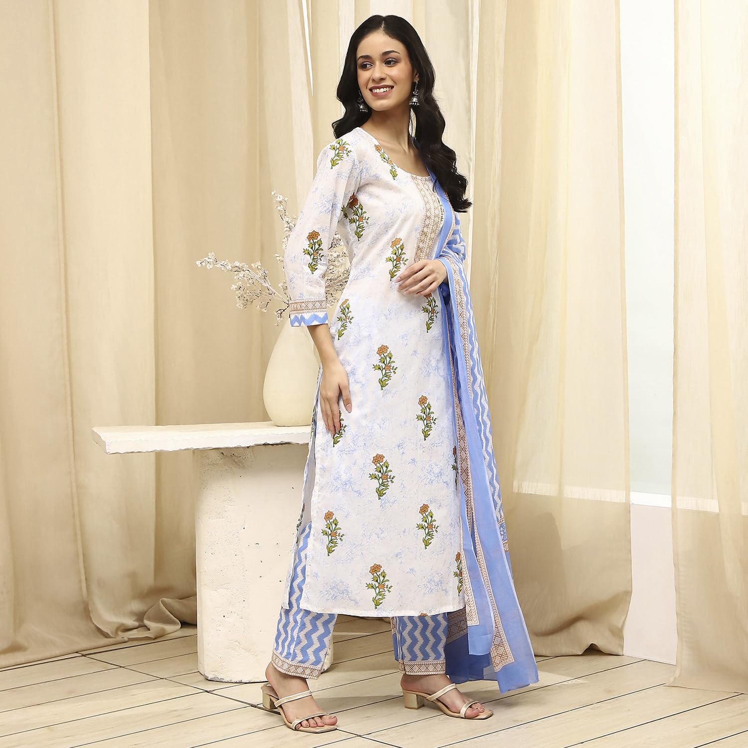 BIBA Women White Cotton Screen Print Unstitched Suit Set_FREE SIZE