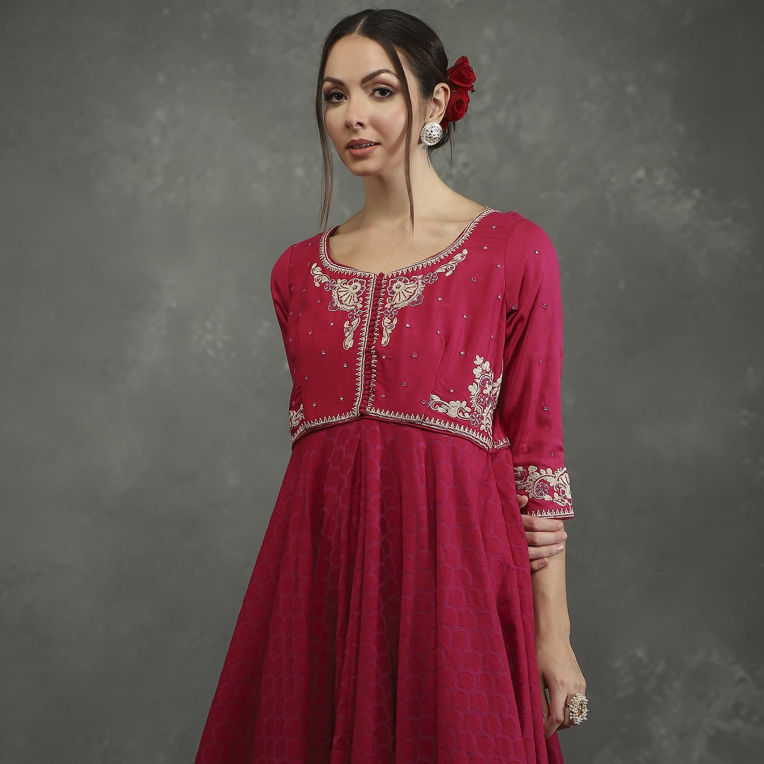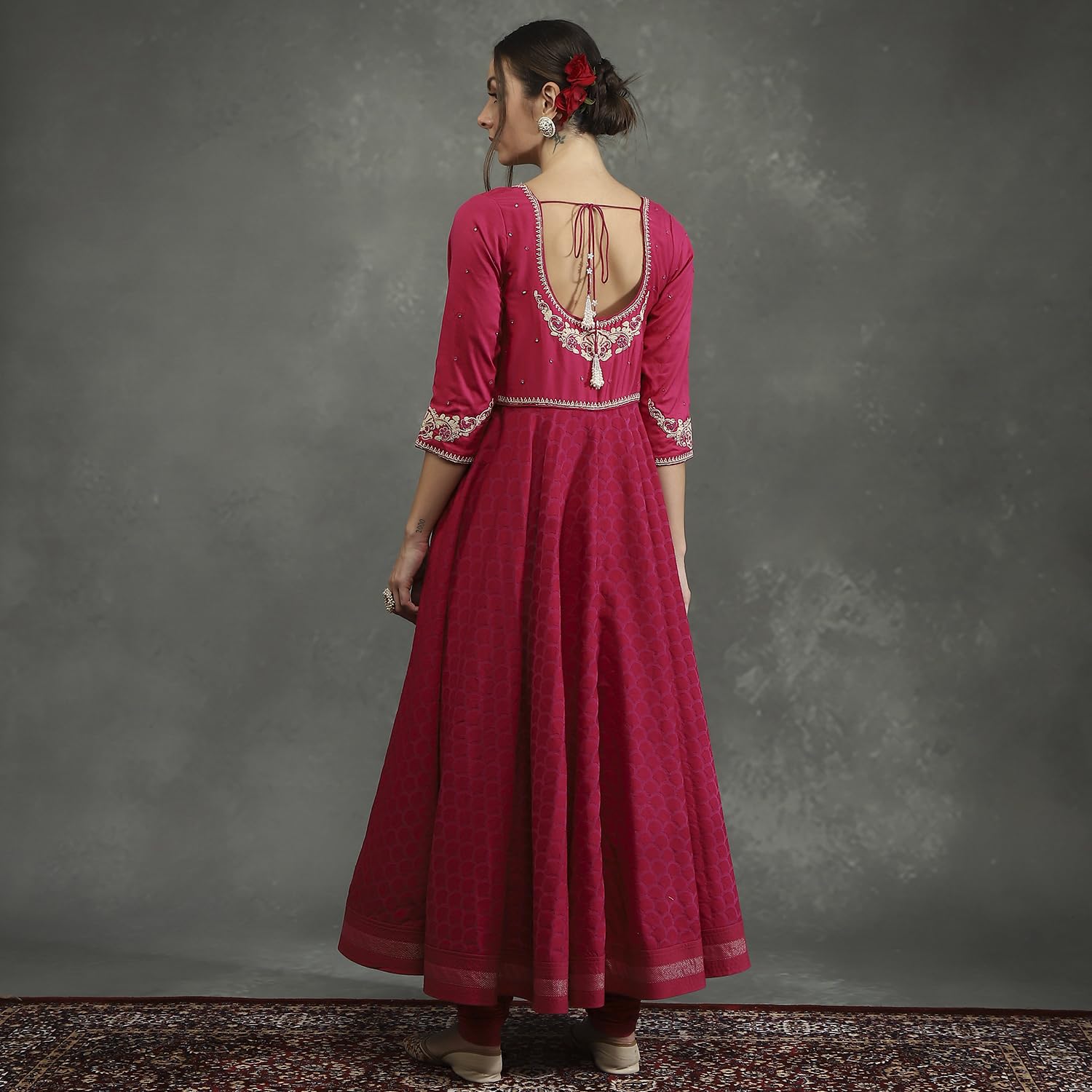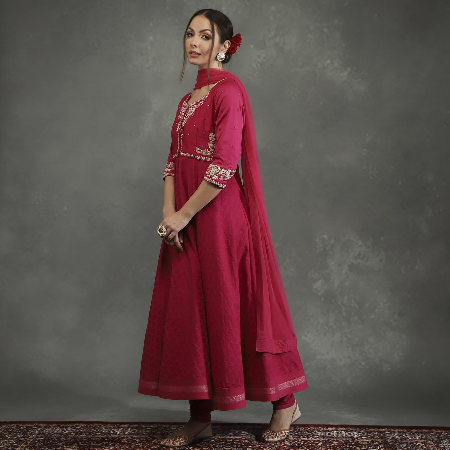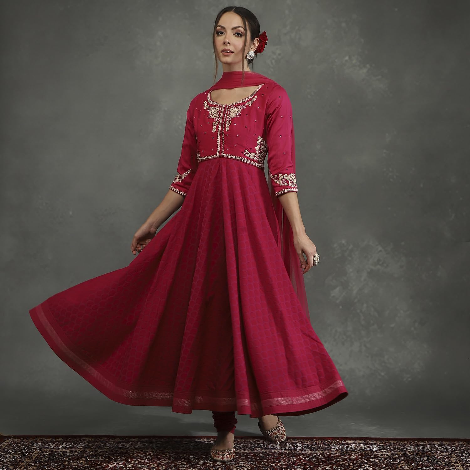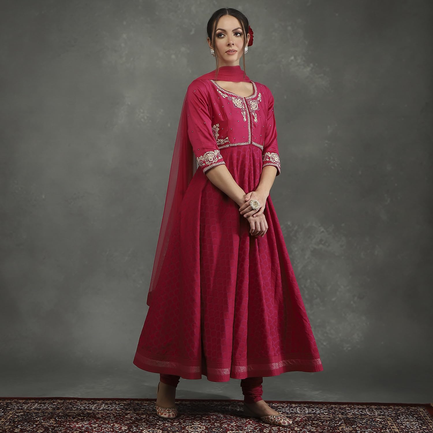 Biba Women Rohit Bal Pink Silk Chanderi Floral Anarkali Suit Set