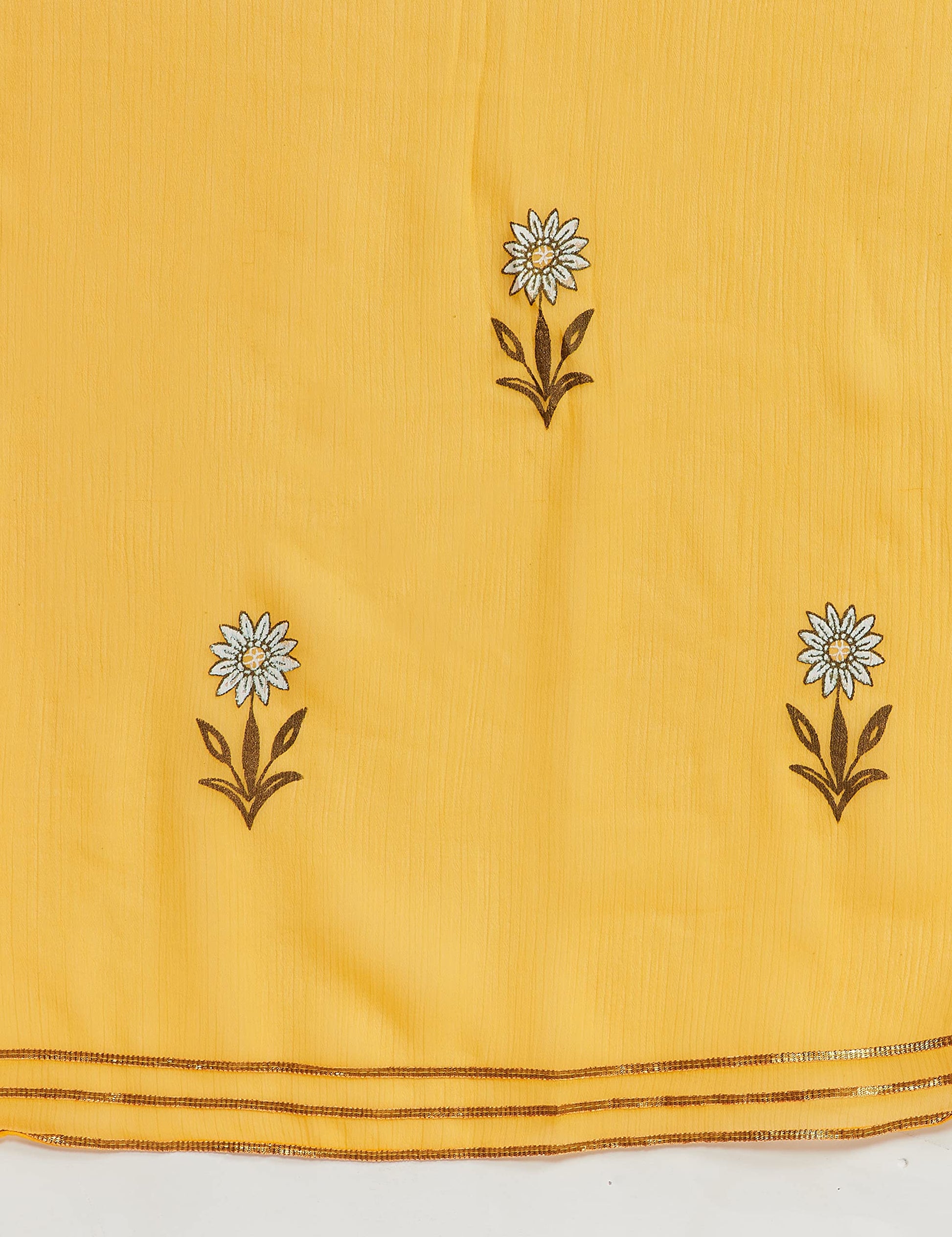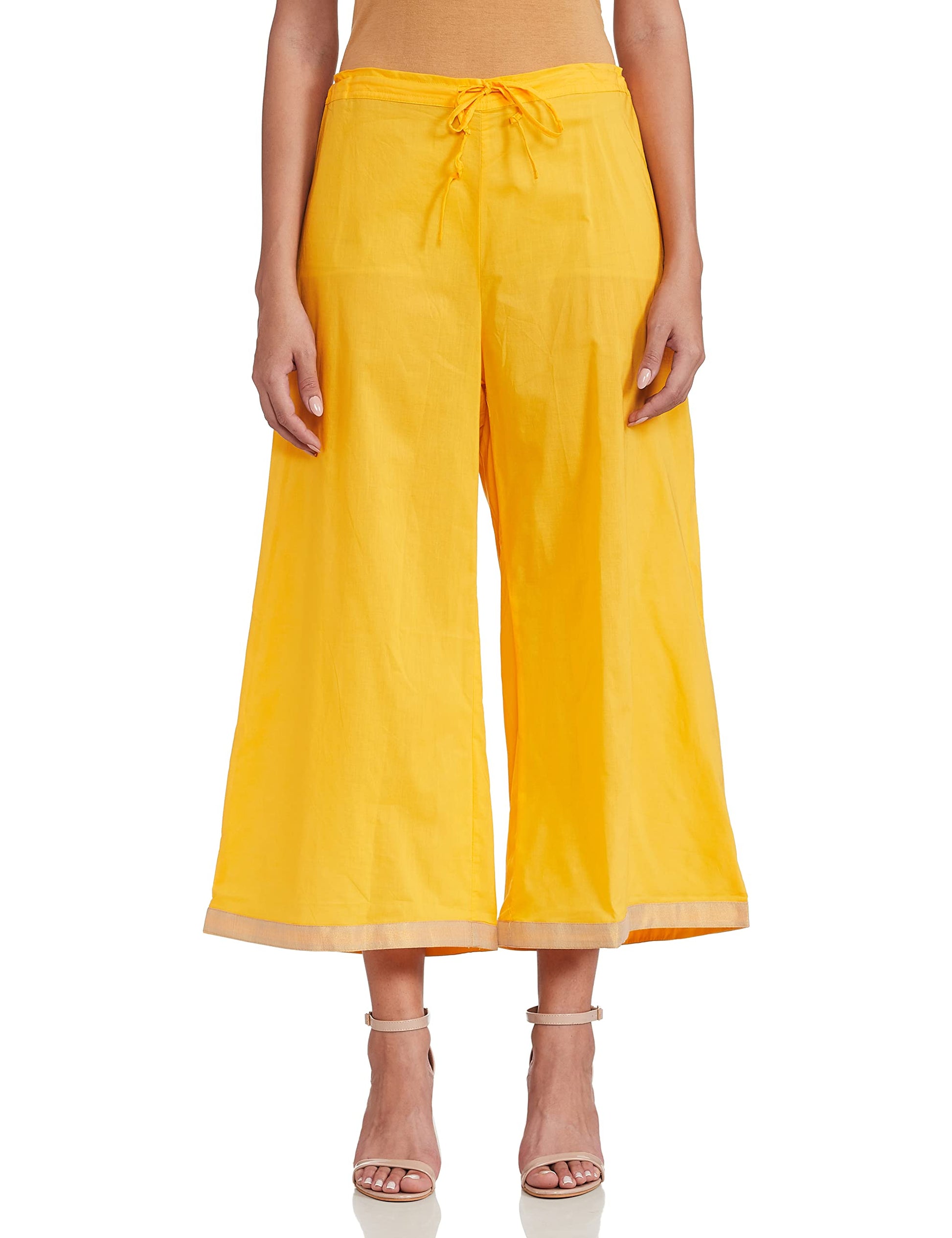 Go for that fluid and graceful look on haldi in a chanderi yellow outfit with white and gold hand block printing. It is paired with solid palazzo pants with highlighted border and styled with a light weight tonal printed chanderi dupatta. Kurta comes with cotton lining.