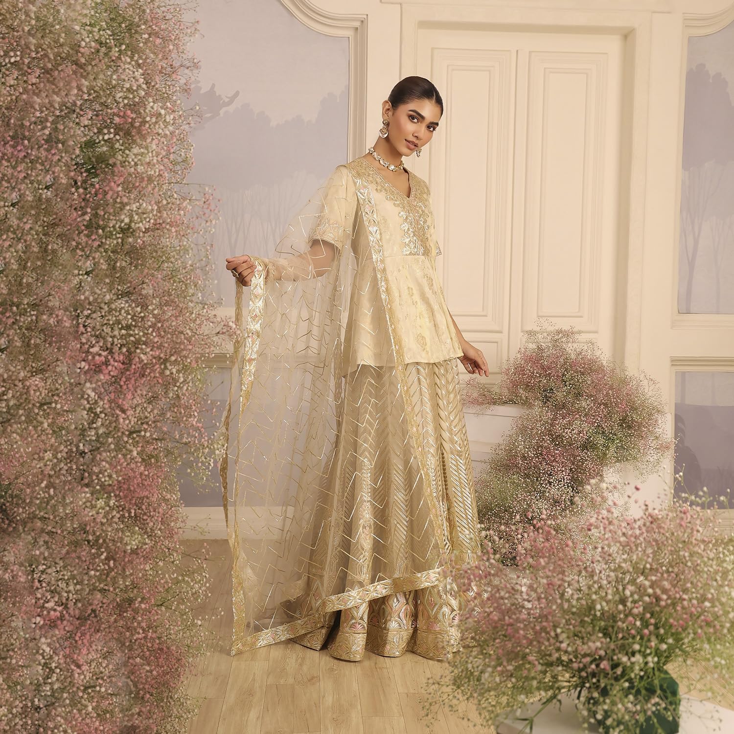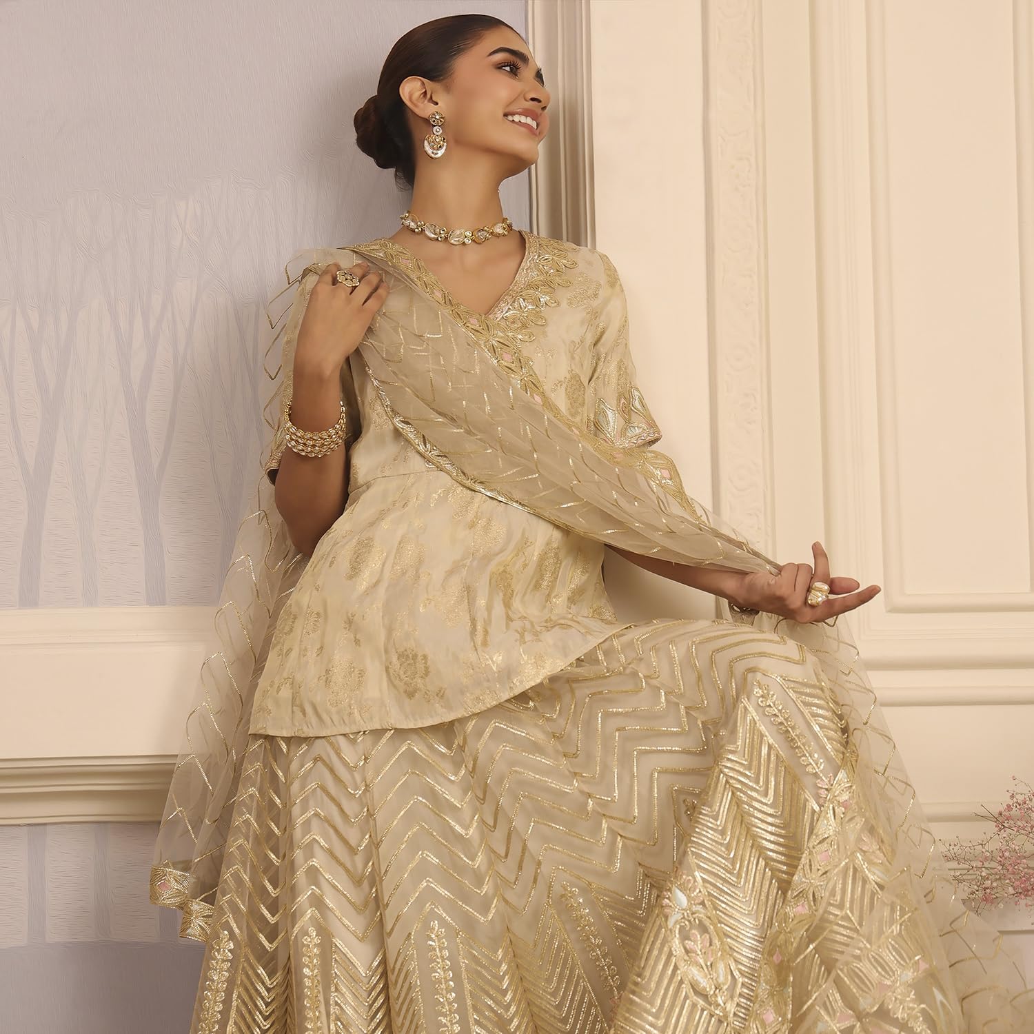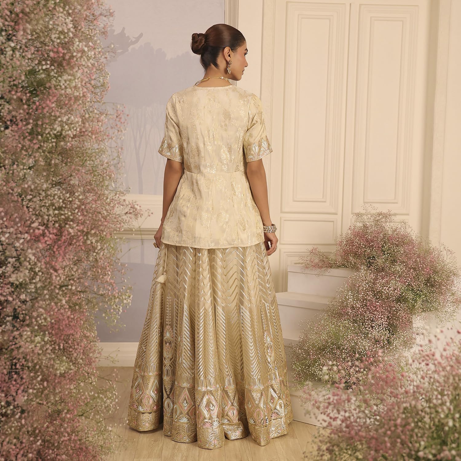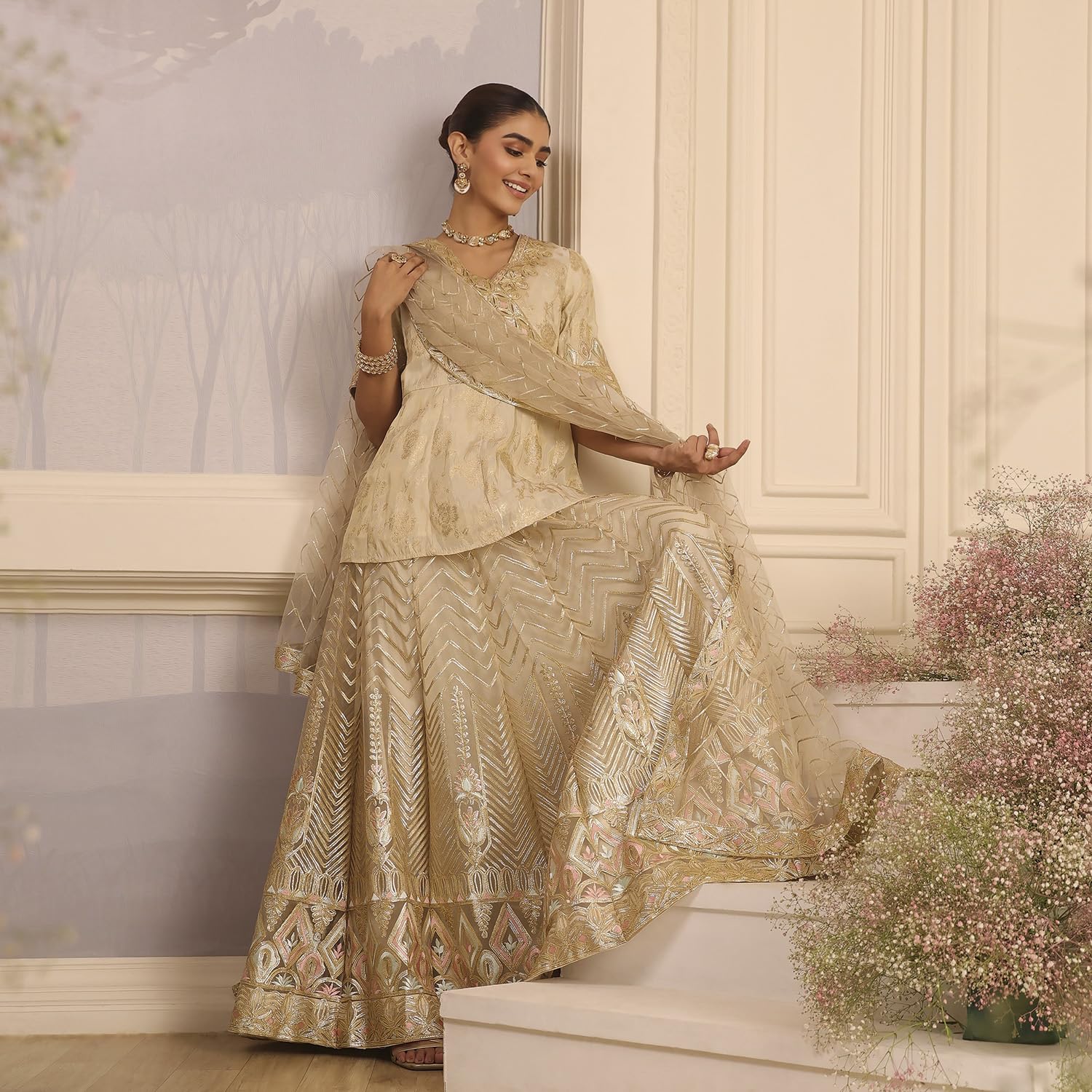 Biba Women Beige Viscose Peplum Embroidered Lehenga Set
