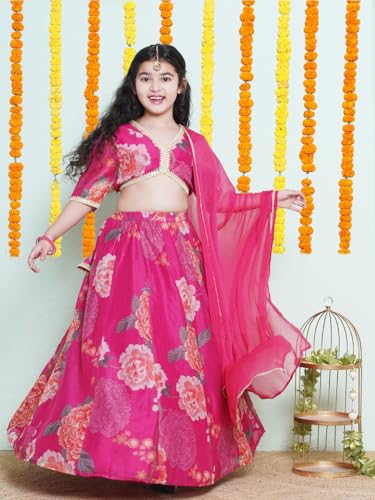 Bitiya by Bhama Girls Pink & Green Multi Printededed Ready to wear Lehenga & Choli with Dupatta