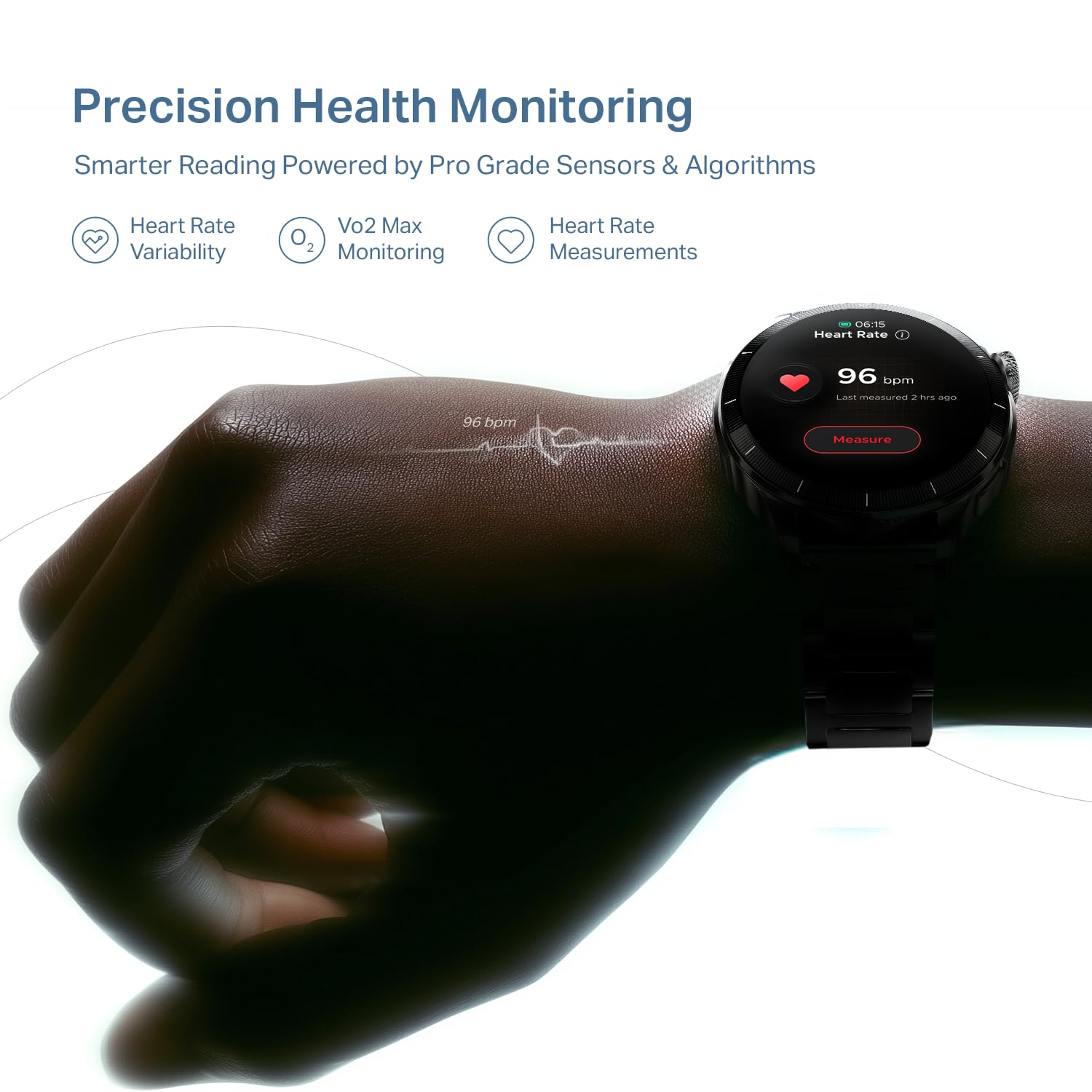 - VO2 Max Measurement: Push beyond basic tracking with VO2, a professional-grade fitness metric on your wrist. After a 20-minute jog or run, check your VO2 max to see how your stamina and endurance are improving. A higher VO2 max means better stamina and endurance. For example, when you go for a jog for 20 minutes, Chrome Eon helps you see how your stamina is improving over time, so you know when to maintain your pace and when to push a little harder.