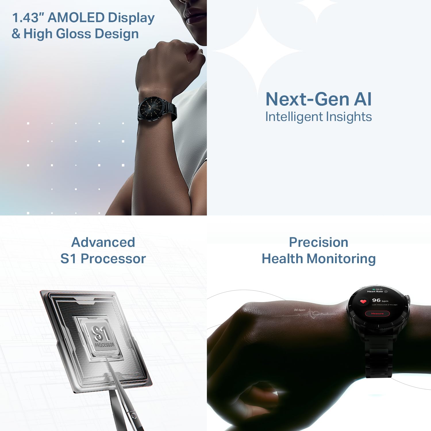 - Advanced S1 Processor: At the core of Chrome Eon is the high-performance S1 processor, powering a premium, next-gen smartwatch experience. Menus open instantly, workouts track without lag, and navigation stays seamless, even when you’re switching between multiple features during intense activity.