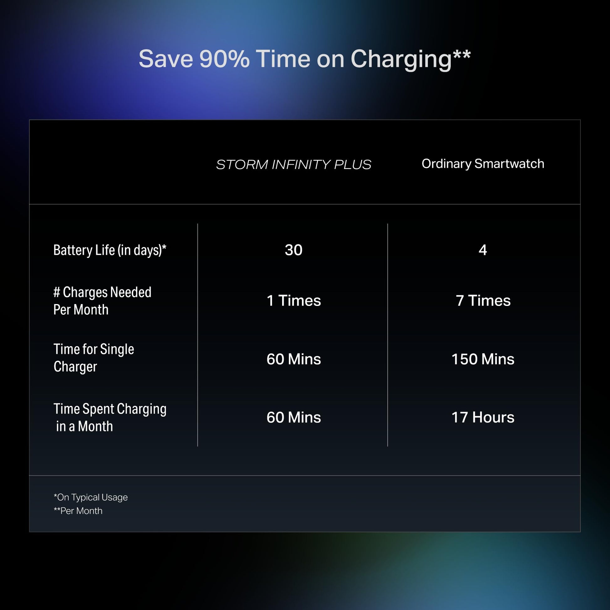 • 20 Days Extensive Battery Life* – Industry’s First: For the first time ever on any smartwatch, Storm Infinity Plus brings you a mega 680 mAh battery that delivers 20 days of heavy use and 30 days with typical usage. That’s up to 5X the battery life of most smartwatches globally.