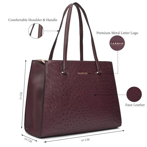 Caprese Britney Large 15.6 Laptop Compatible Tote Bag for Women | Animal Texture Faux Leather Shoulder Handbag | Spacious Office & Travel Bag | Dual Zipper & Magnetic Button Closure (Cherry Lacquer)