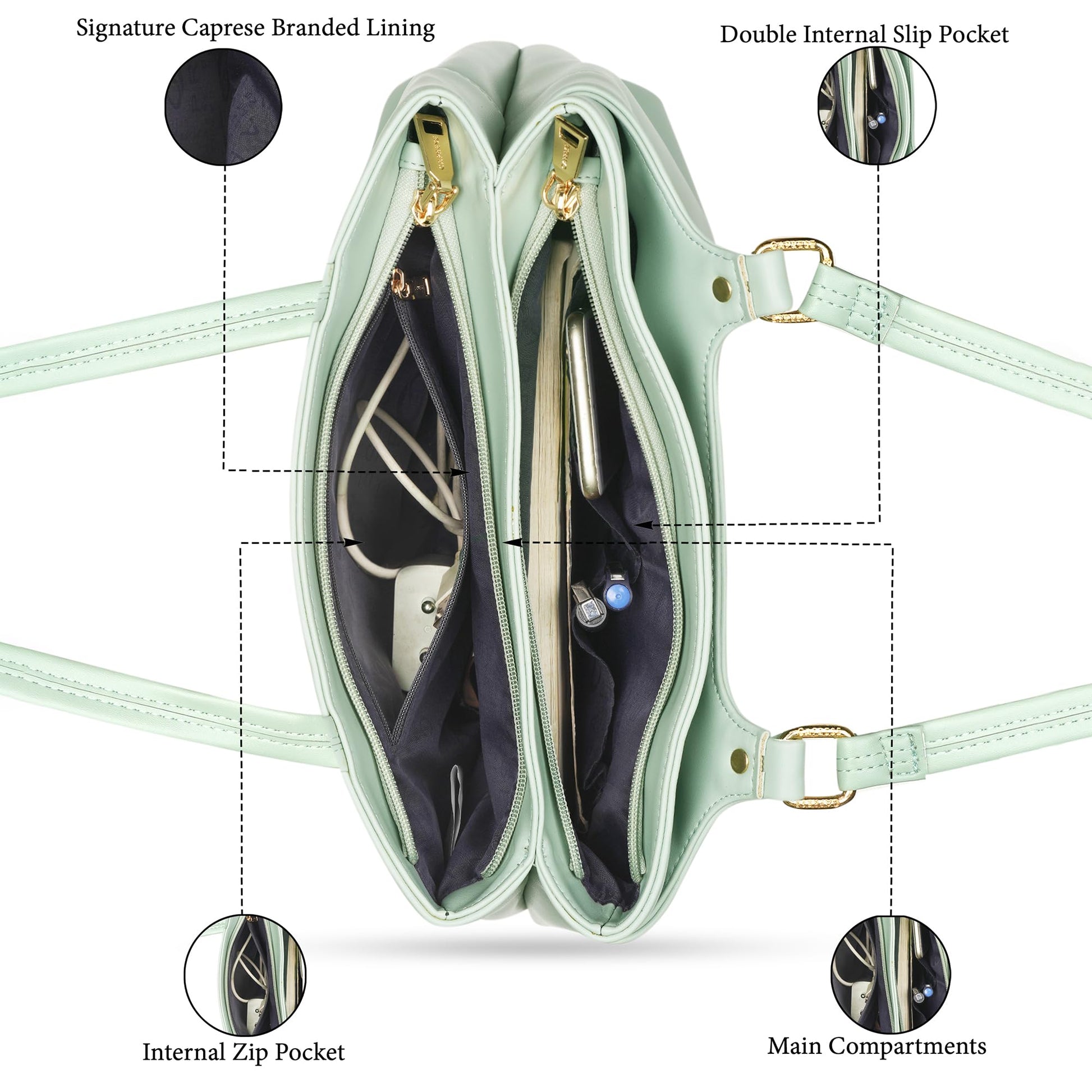 - Stay organized with the easy access back pocket of the Caprese Handbag. This feature is perfect for essentials, making it an ideal office bag or college bag. Designed as a laptop bag for women handbag, it ensures quick access to your essentials, keeping you prepared on the go.