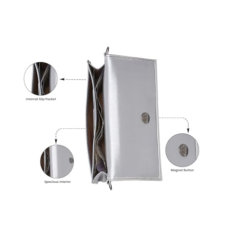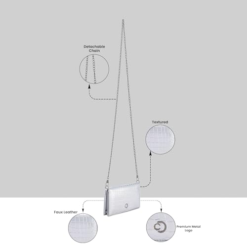 Caprese Vega Textured Flap Wallet Convertible Sling for Women | 2-in-1 Handheld Clutch & Shoulder Bag with Detachable Gold Chain | Premium Designer Mobile & Cash Sling with Magnet Snap (Silver)
