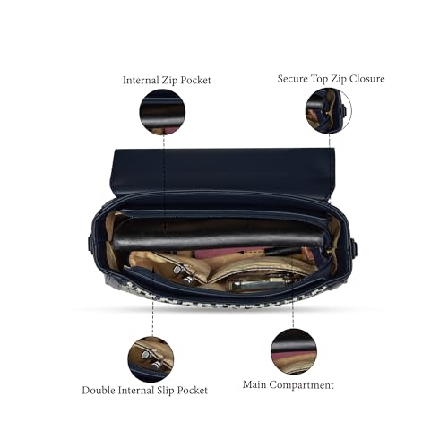 Caprese Wind Medium Satchel Bag for Women | Woven Texture Faux Leather Shoulder Bag with Adjustable & Detachable Strap | Dual Zipper & Magnetic Button Closure for Office & Casual Use (Midnight Blue)