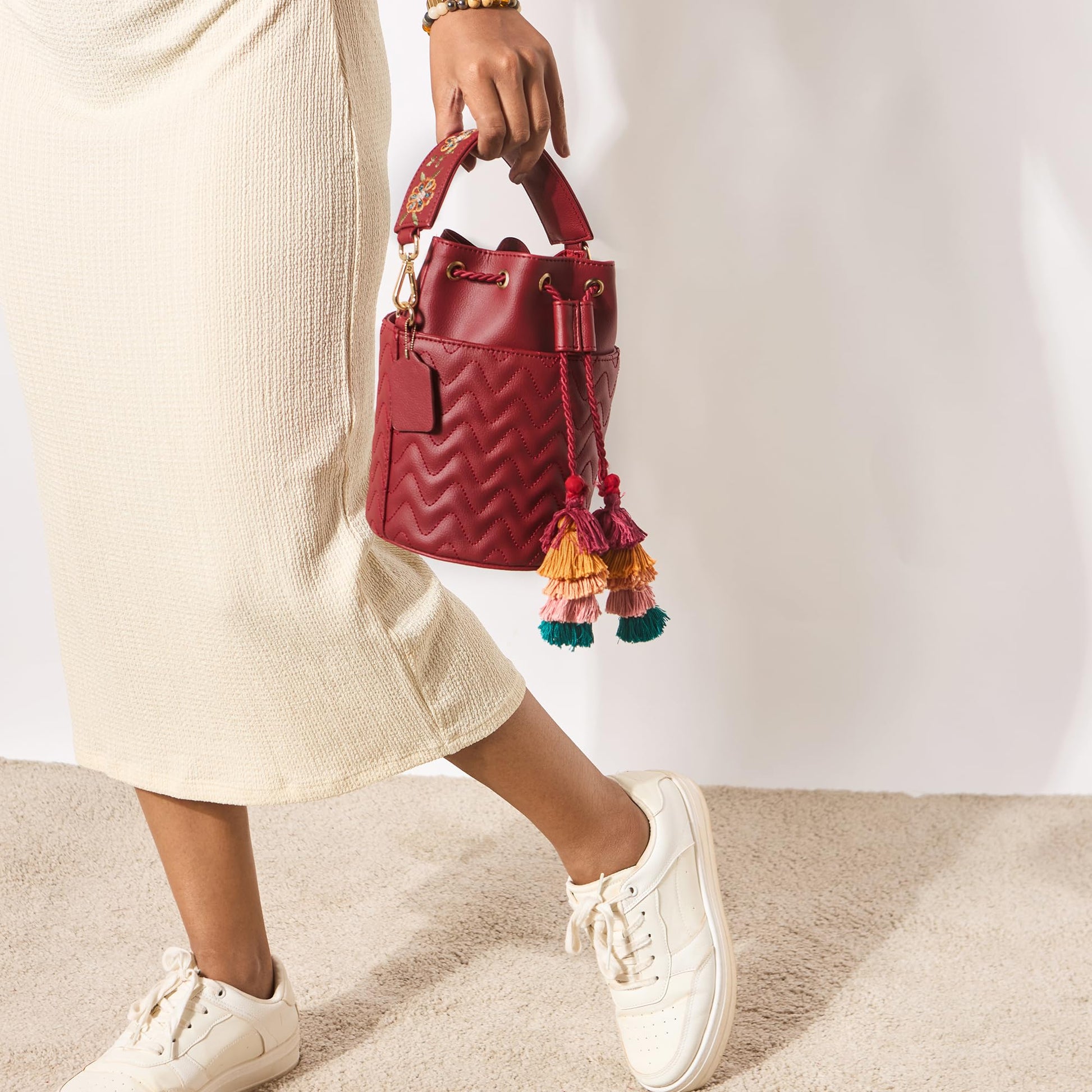 Chumbak Maroon Crossbody Sling Bag for Women, Drawstring Closure, Palace Memoirs Collection, Stylish Designer Handbag Purse Wallet Sling Tote, Everyday Casual Ethnic Travel Office Use