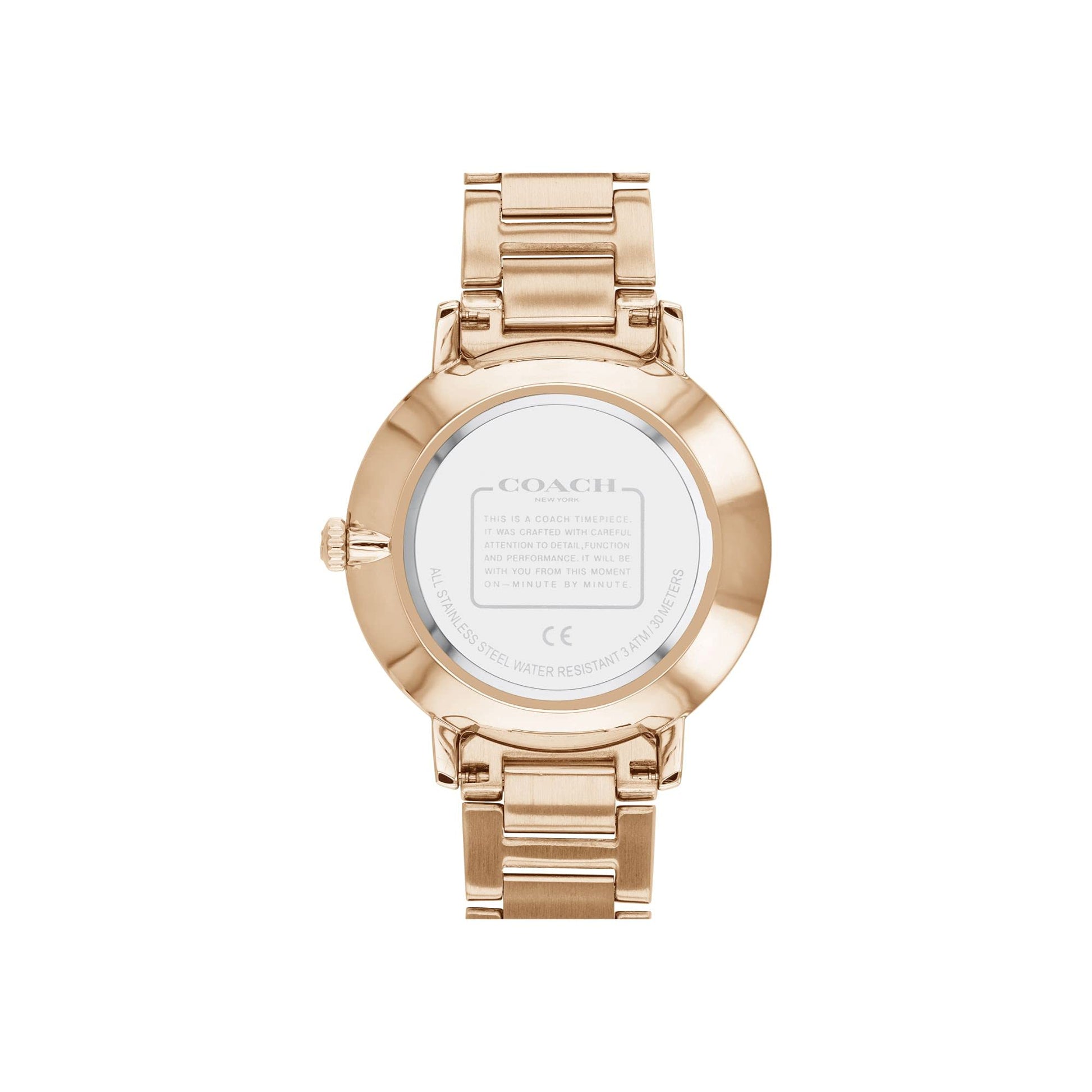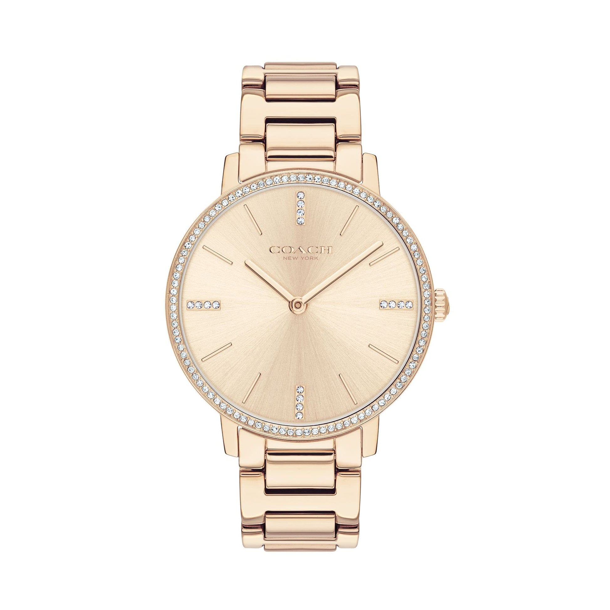 A sophisticated minimalist design, the Audrey is a refined bracelet watch perfect for day and evening. The carnation gold tone timepiece brightly sparkles with a Swarovski crystal-encrusted bezel and markers.